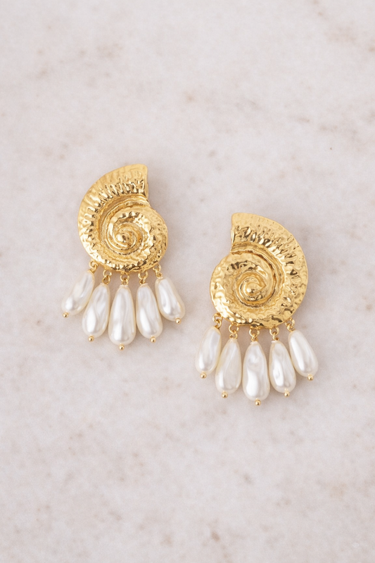 L’effet “bijou statement” parfait : un coquillage doré texturé et des perles nacrées qui accrochent...