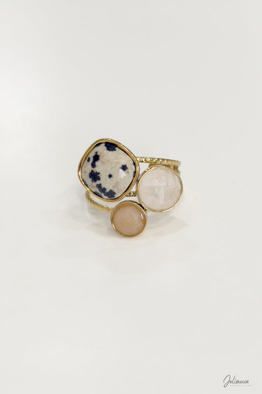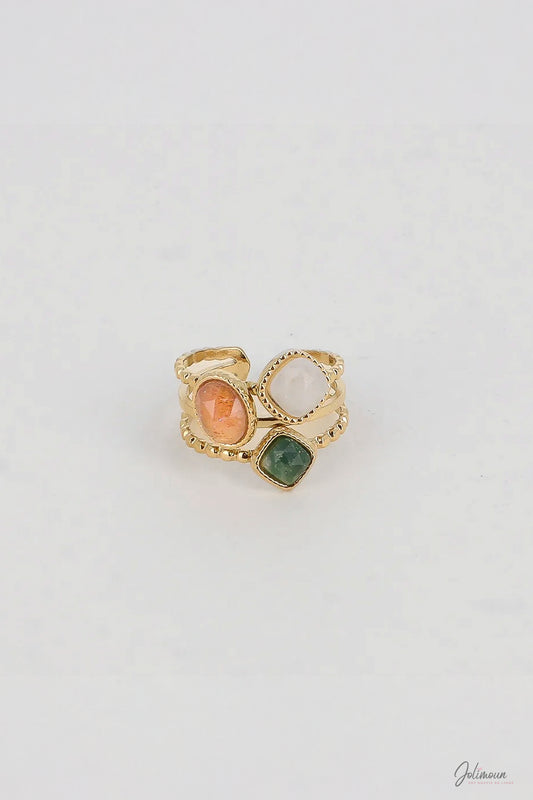 Une bague lumineuse et originale, avec trois pierres qui apportent tout de suite du caractère...