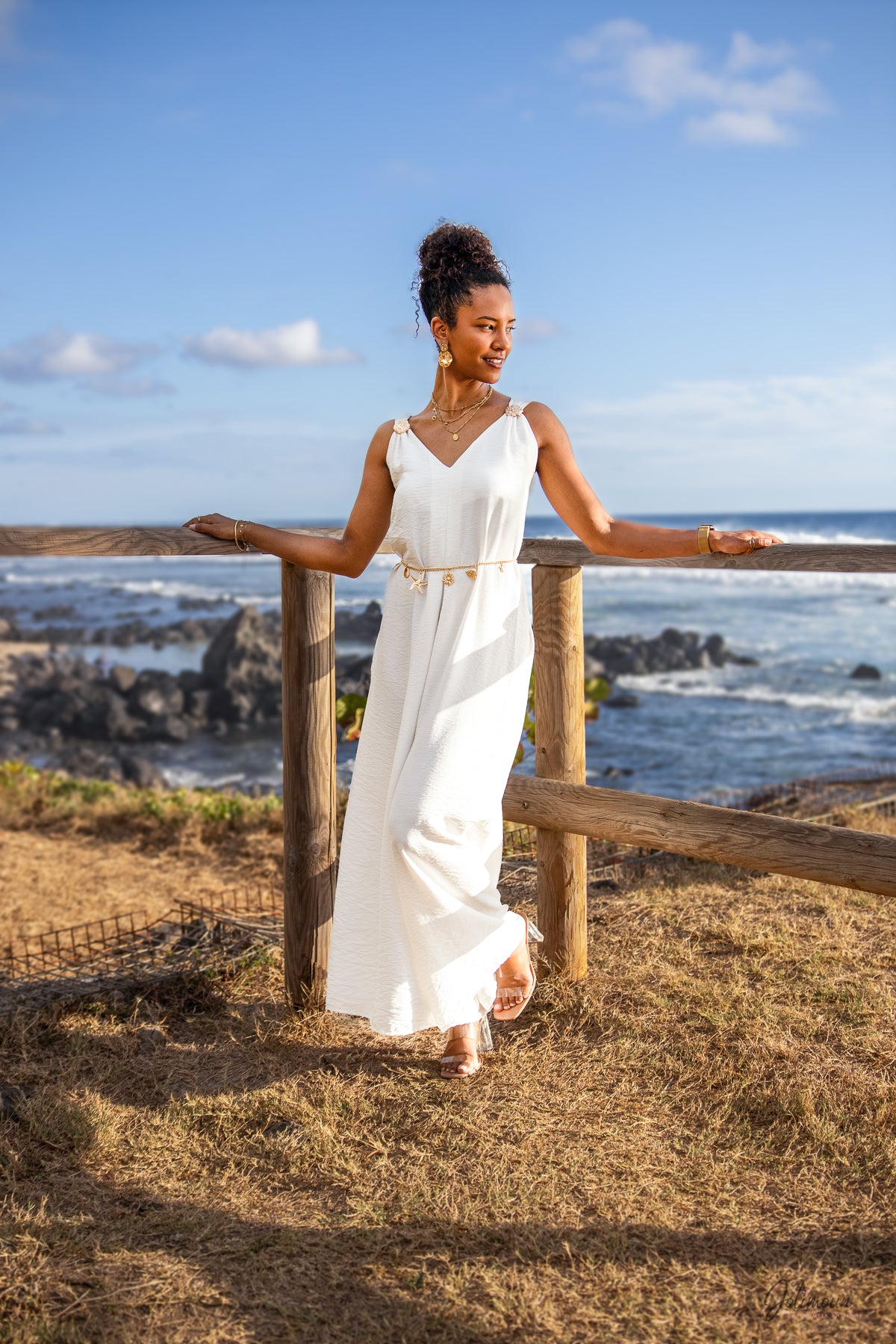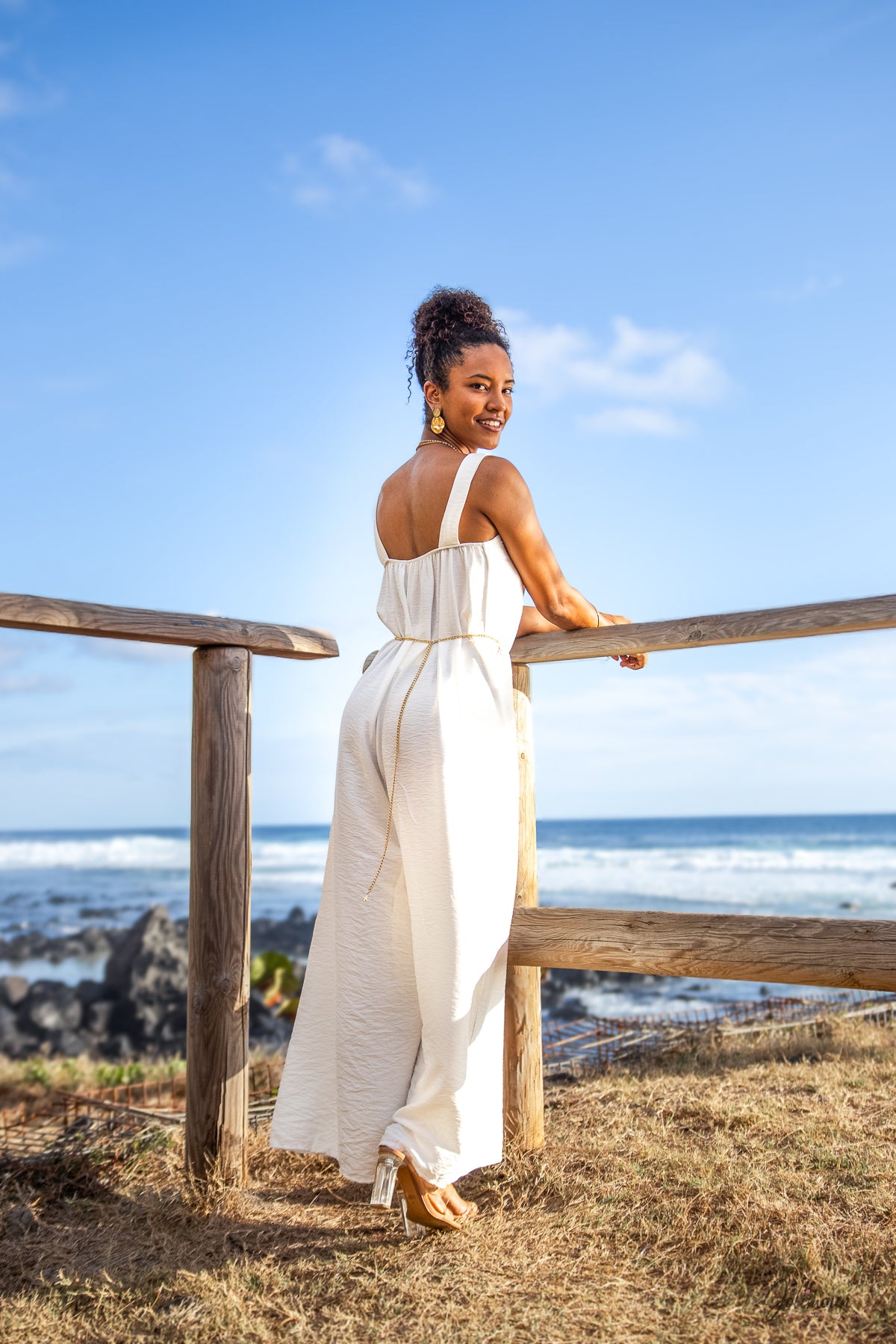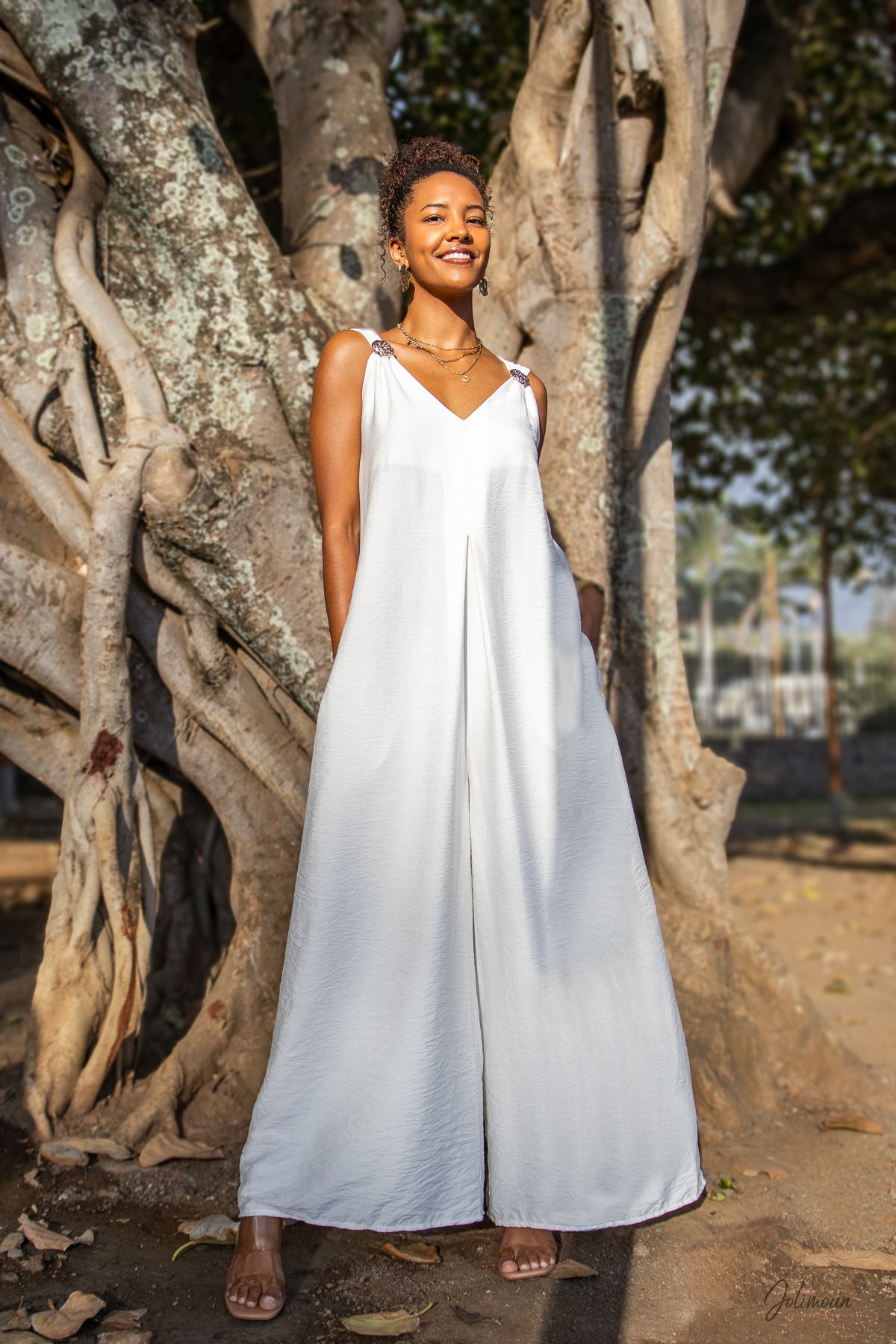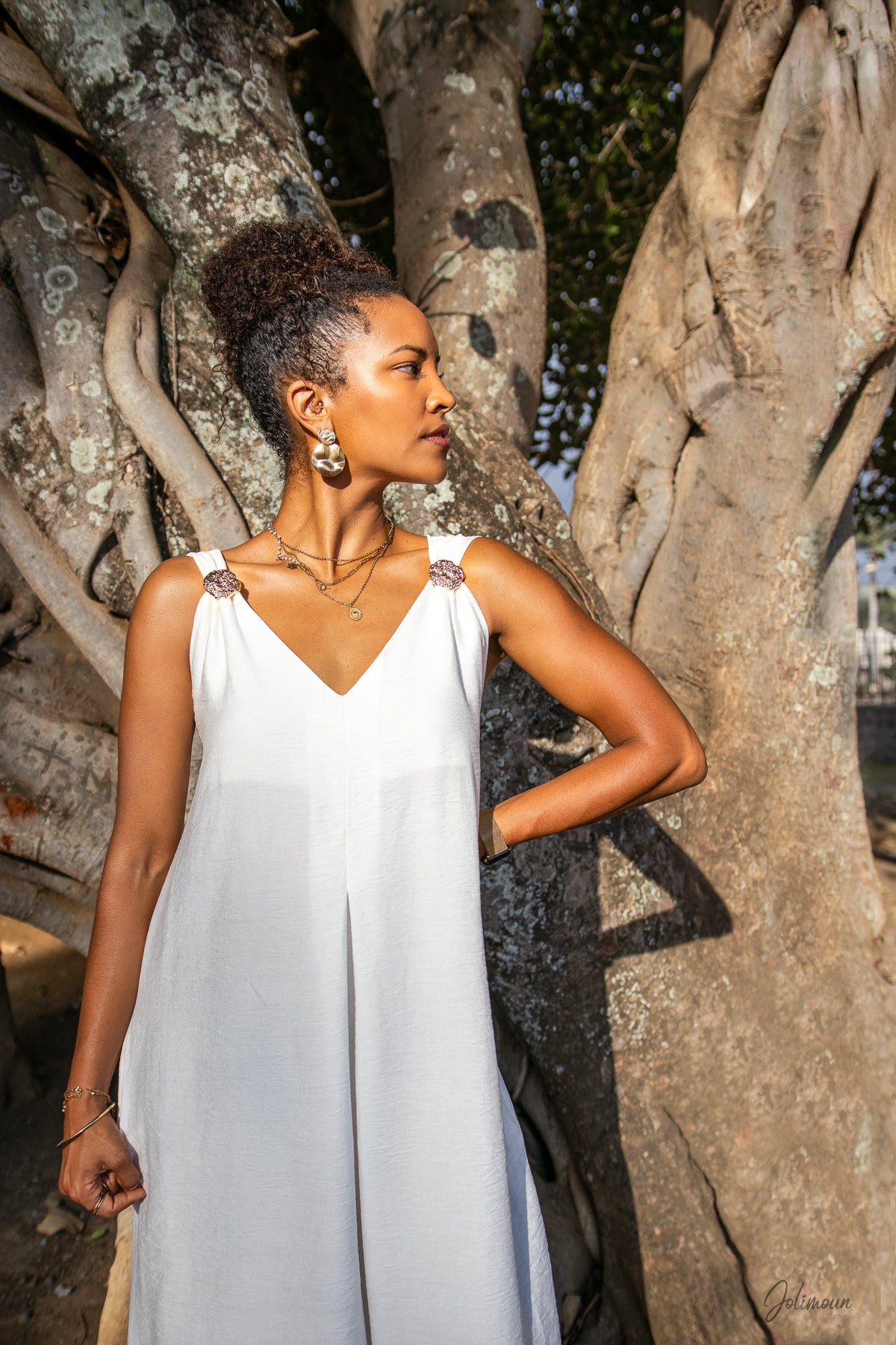 Abbie – Combinaison pantalon fluide blanche détail bijou