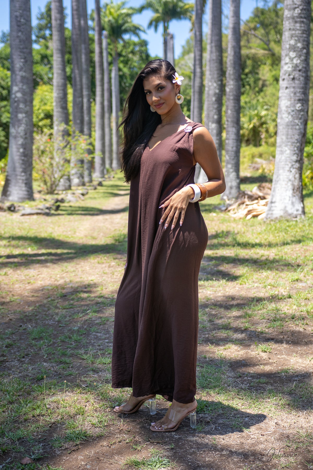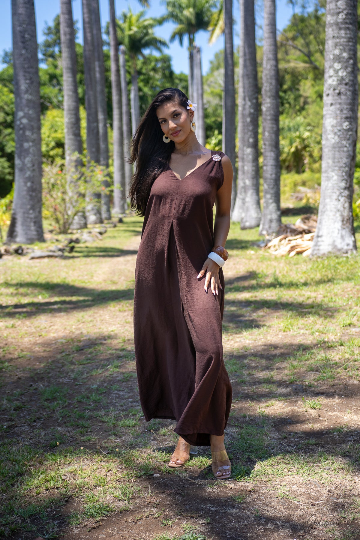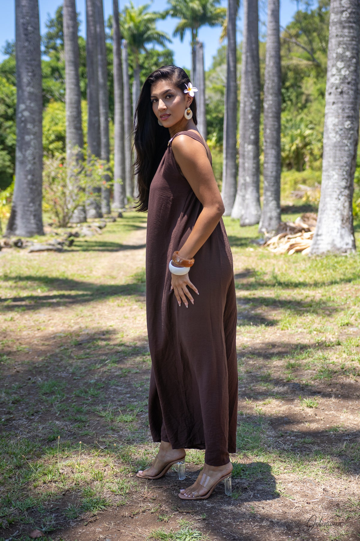Abbie – Combinaison pantalon fluide marron détail bijou