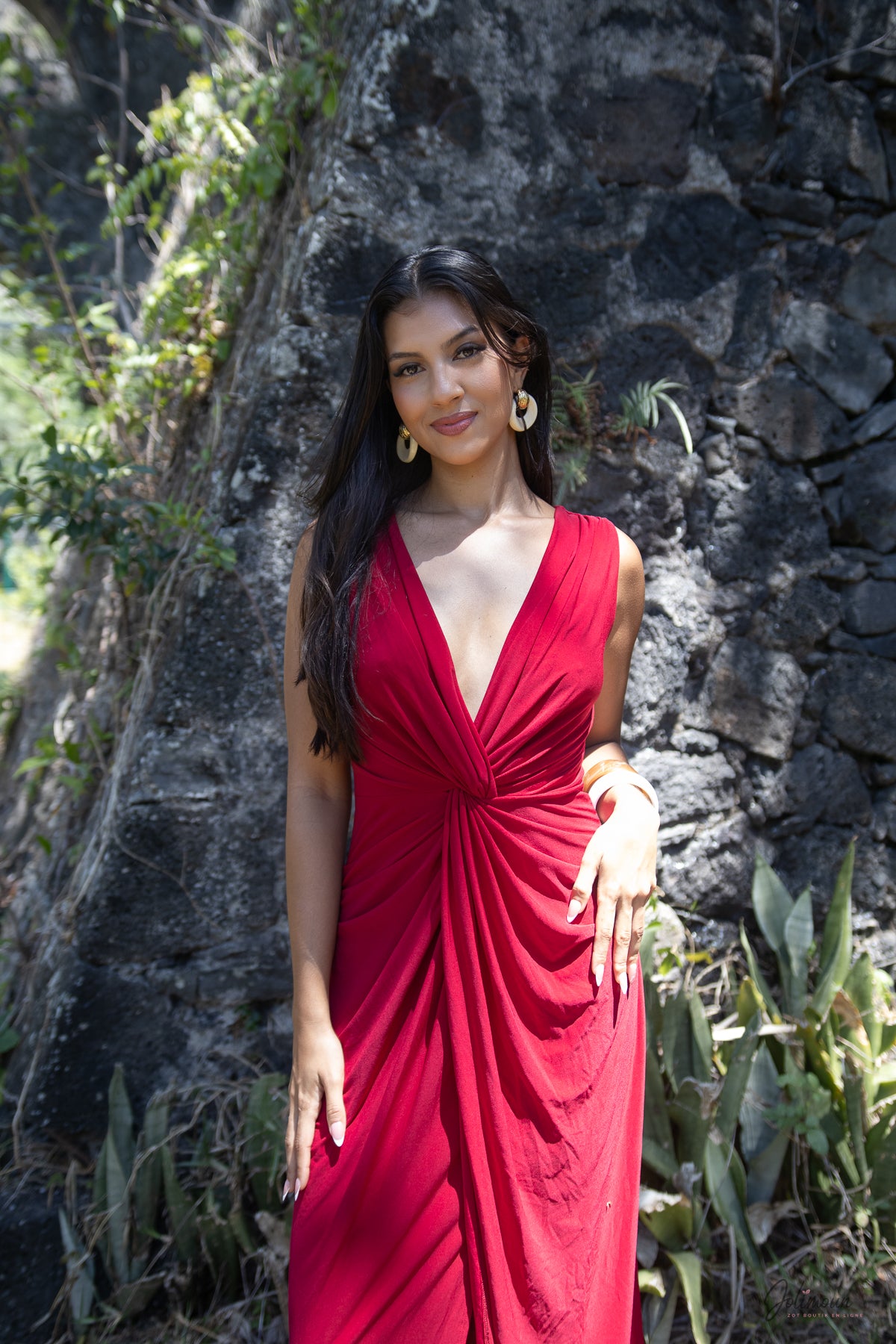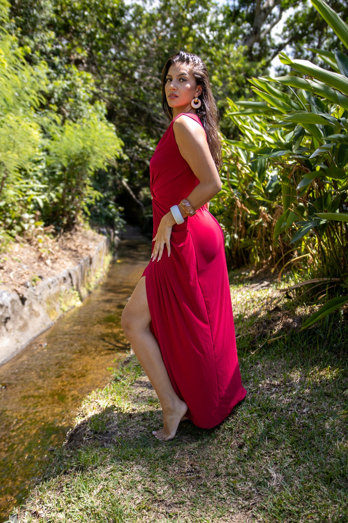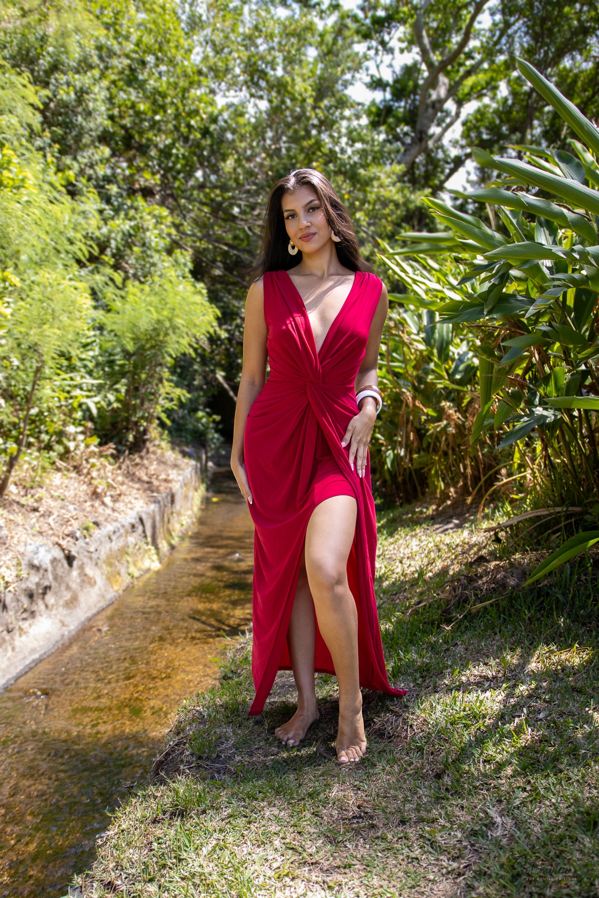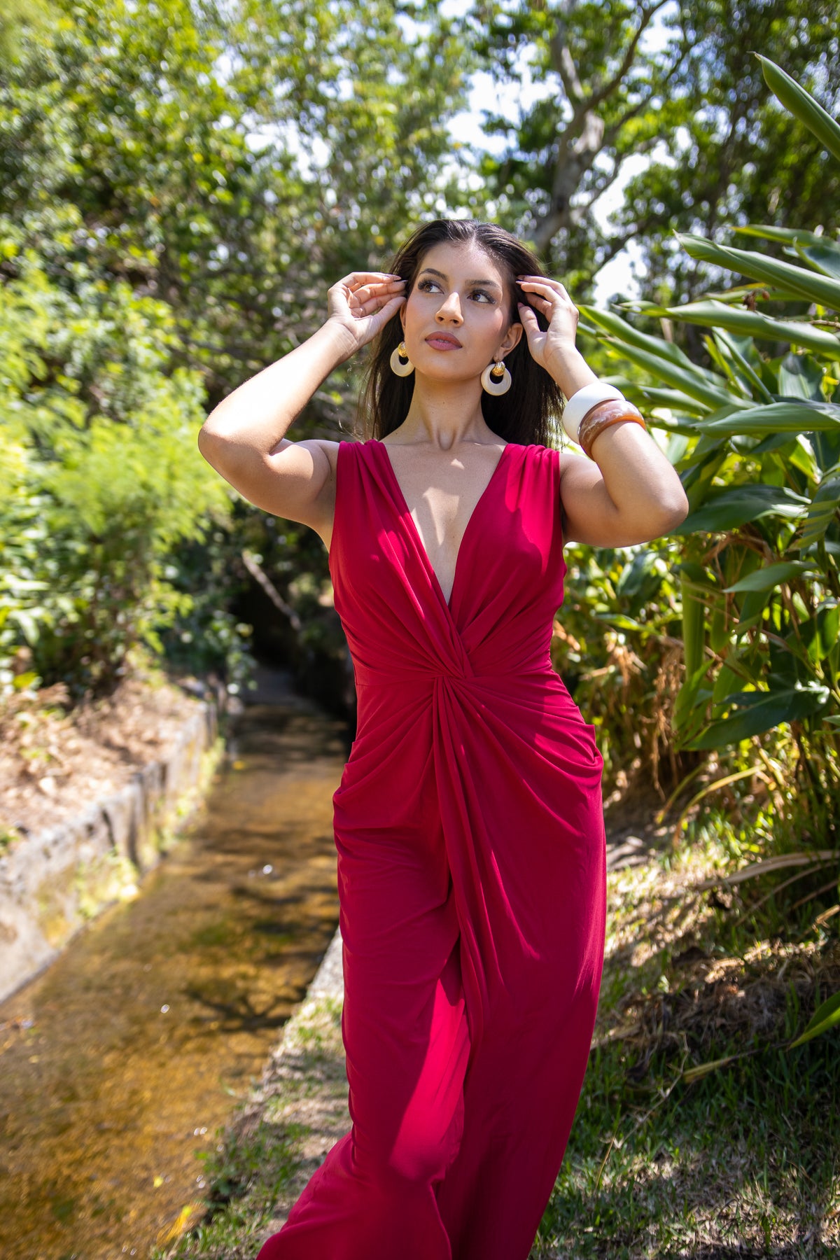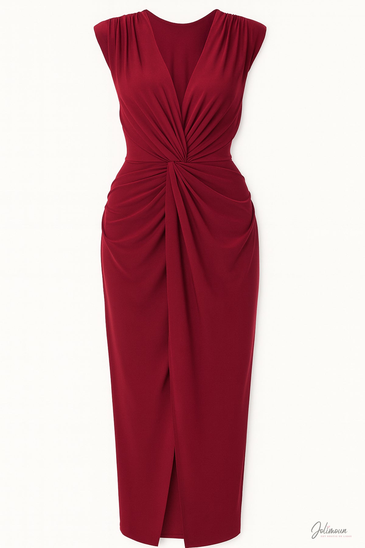 Adrianna – Robe longue bordeaux drapée effet sculptant