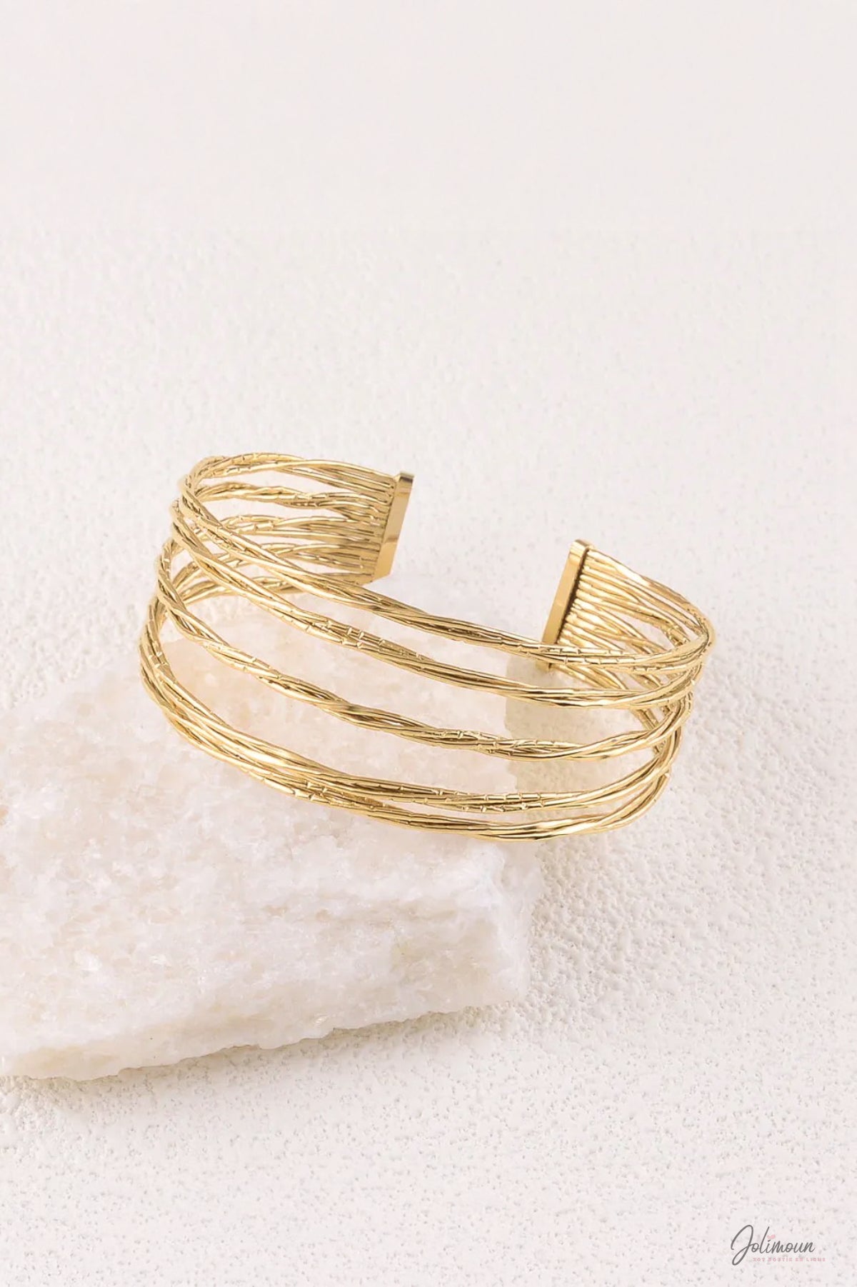 Aline - Bracelet manchette doré 5 joncs torsadés striés ajustable