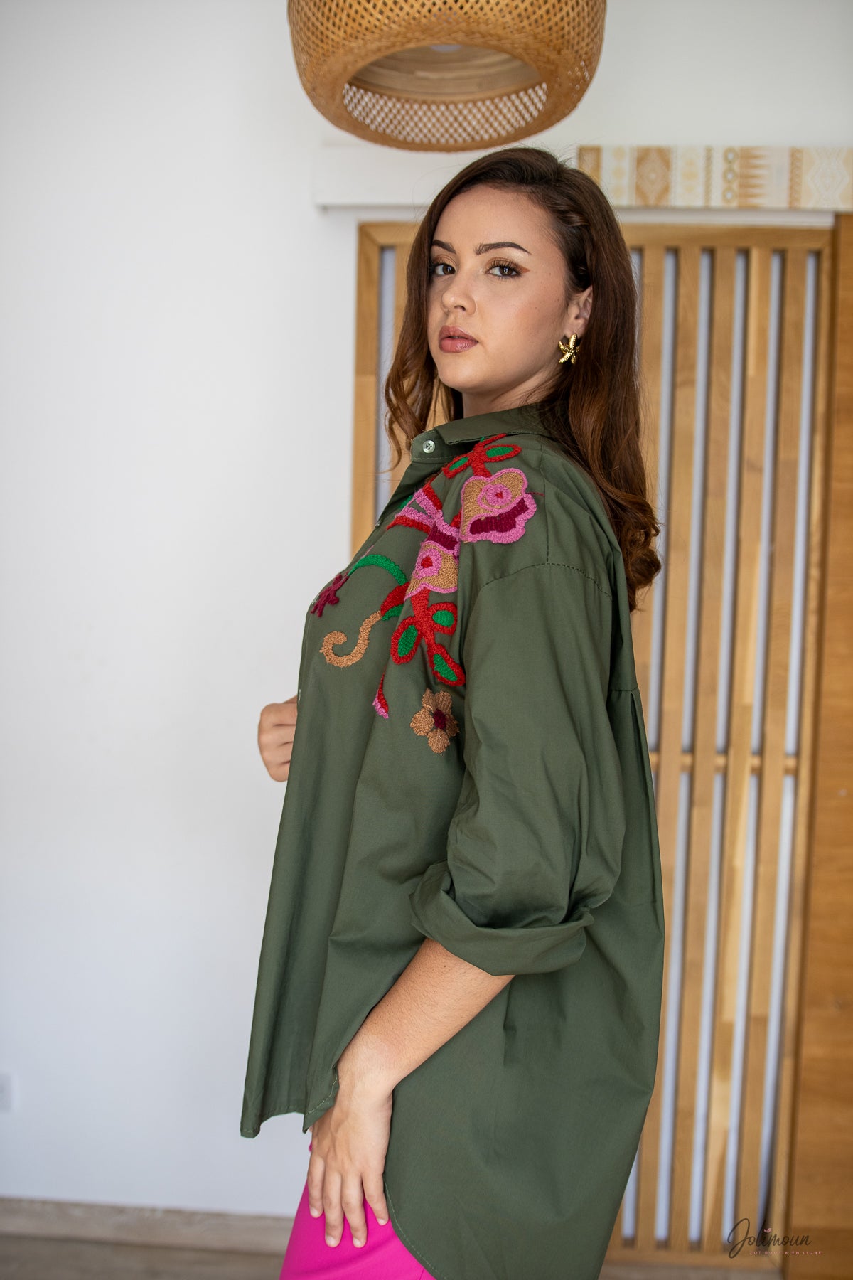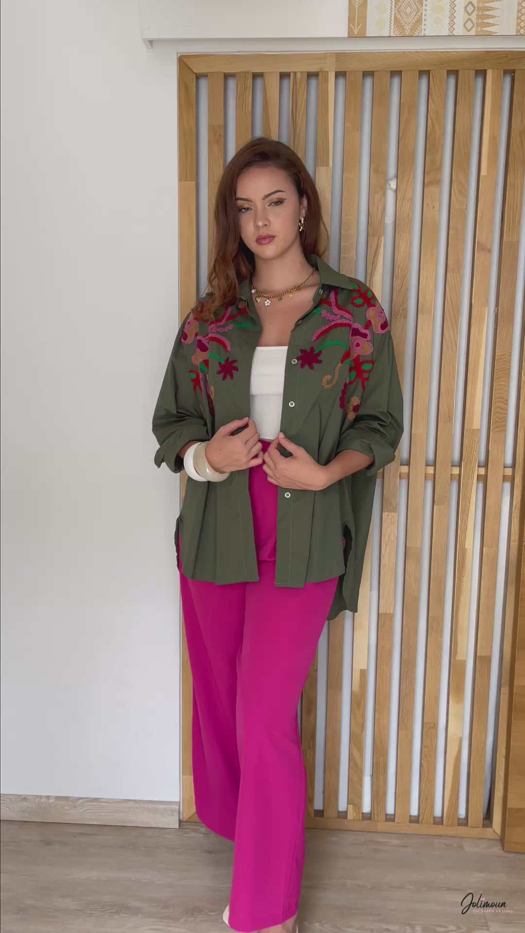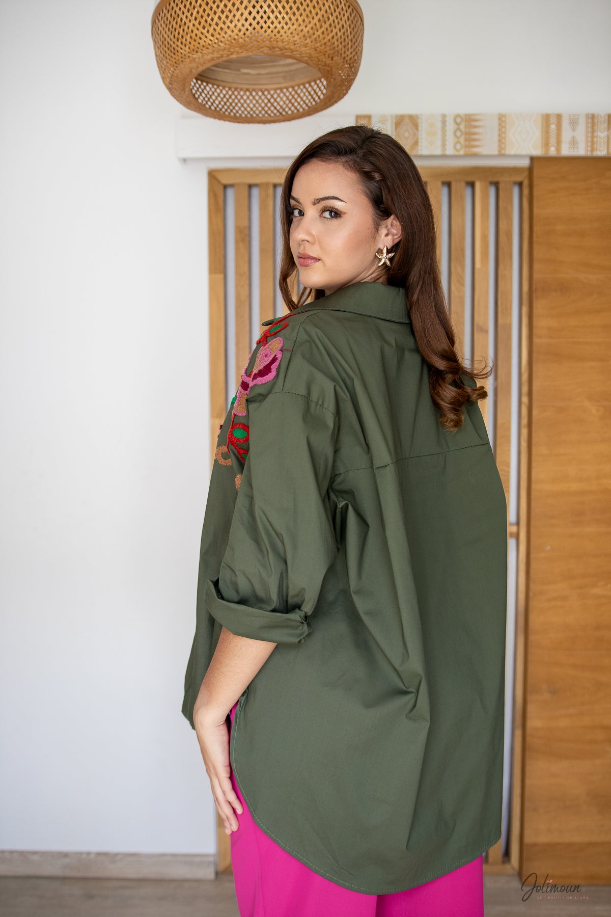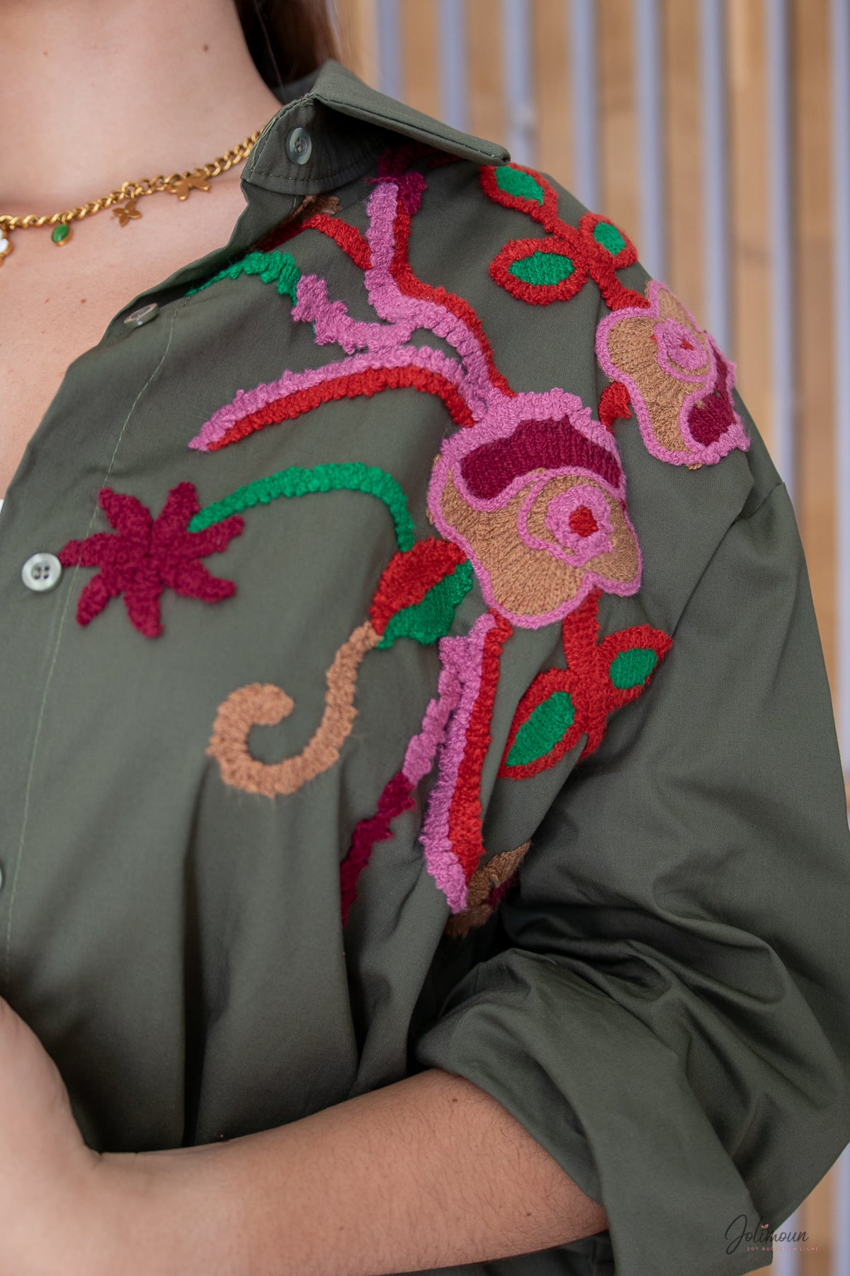 Apoline – Chemise oversize kaki broderies florales multicolores