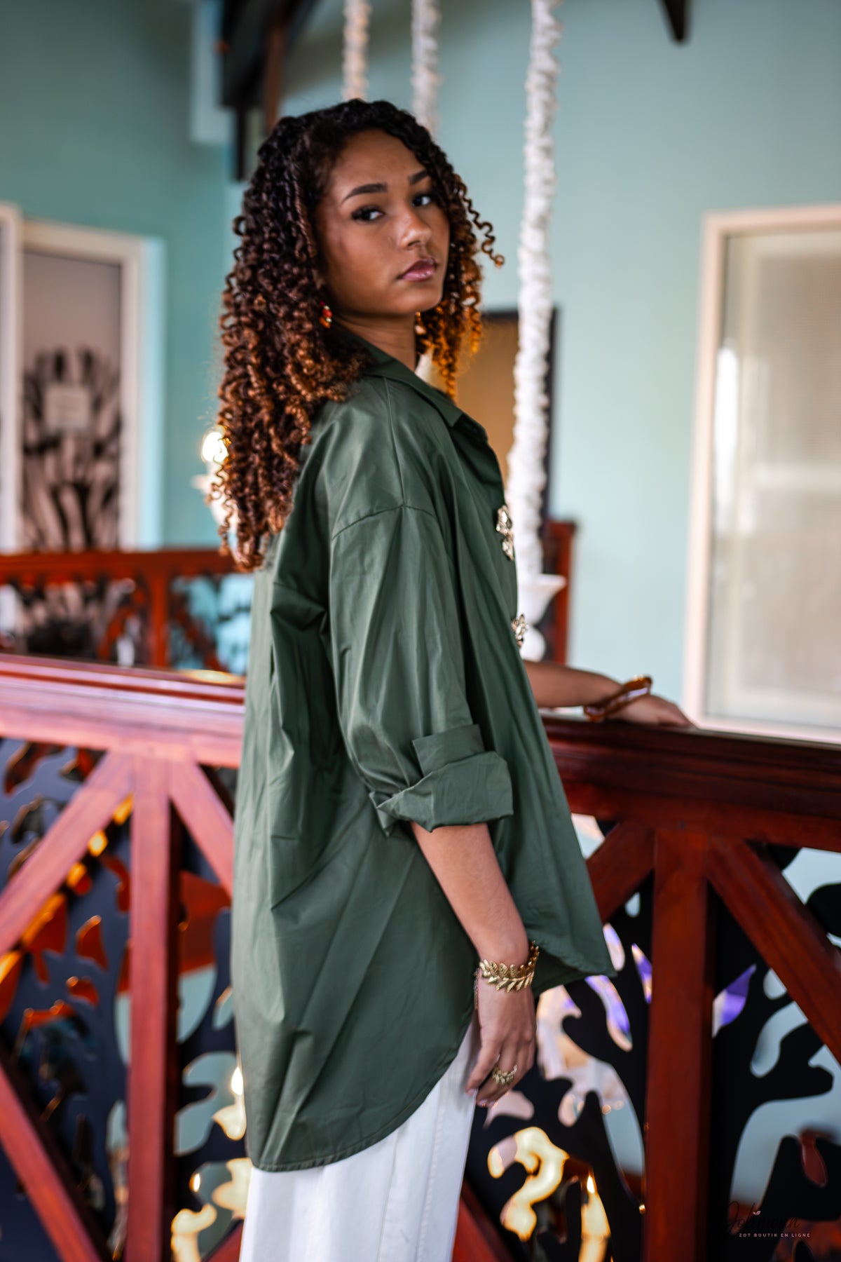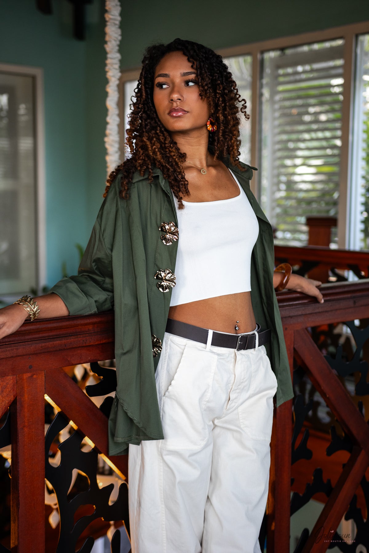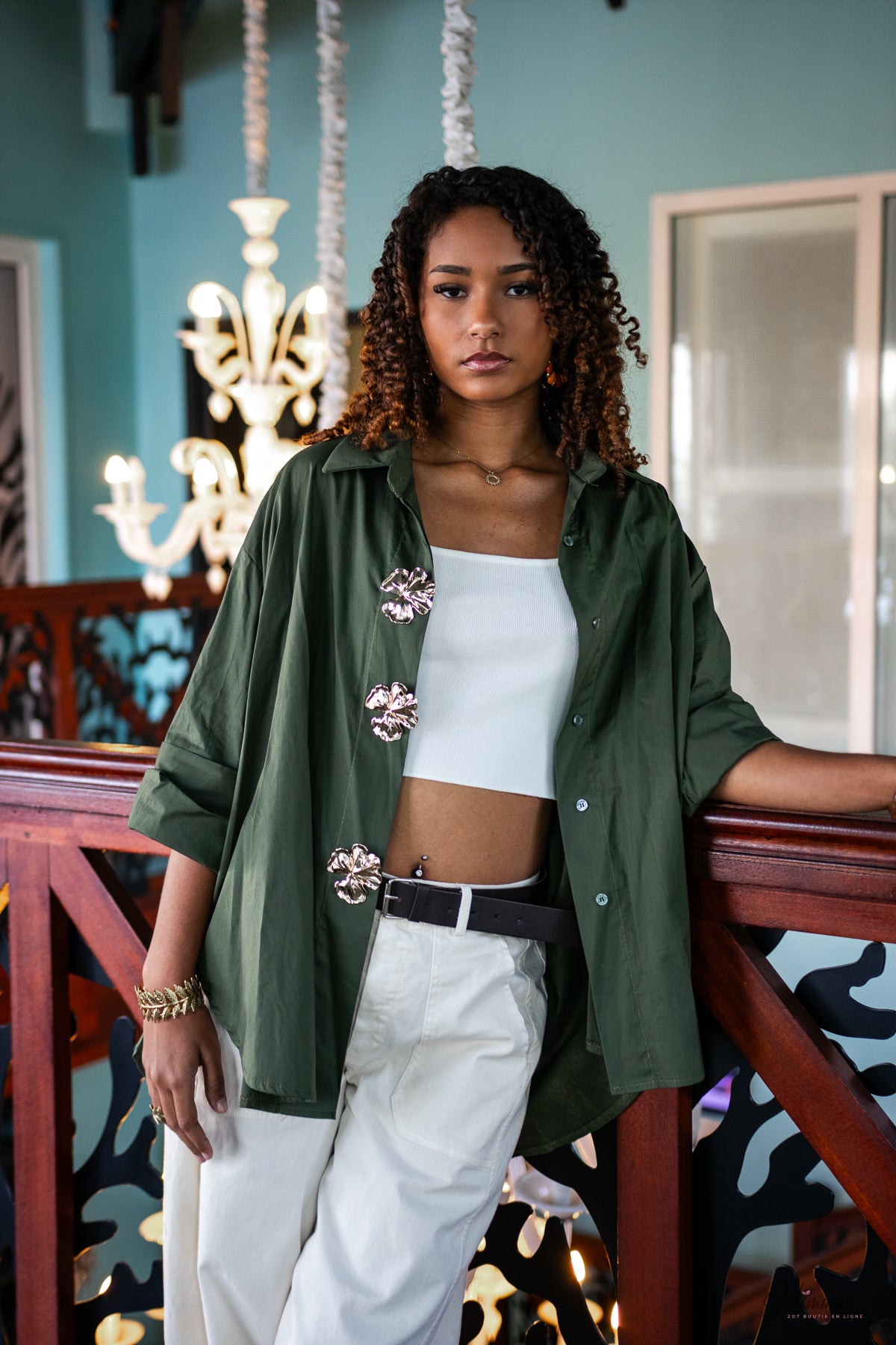 Ayona – Chemise oversize kaki à broches fleurs dorées 100% coton
