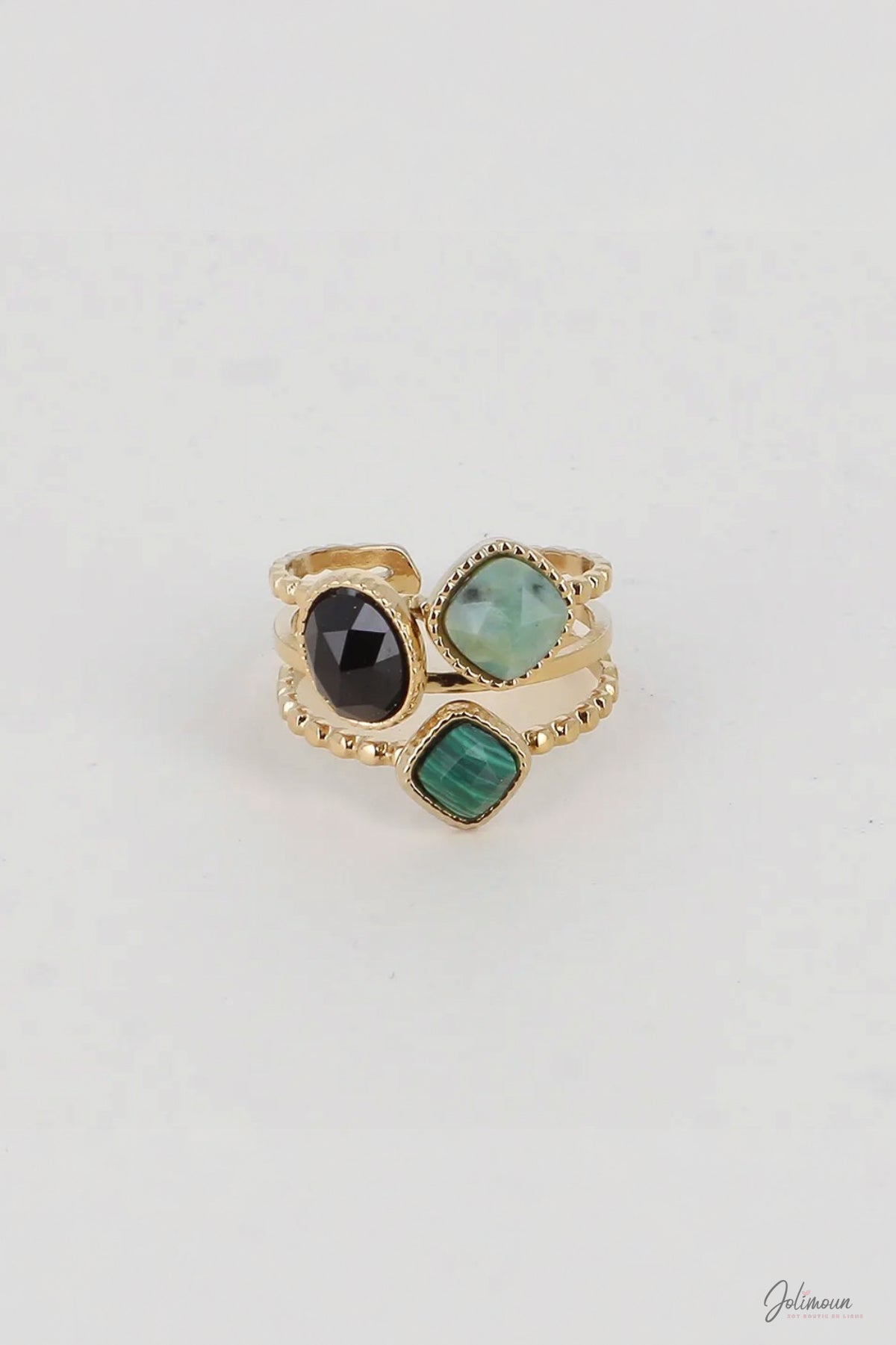 Un trio de pierres contrasté et élégant : le noir profond, le vert d’eau et le vert marbré pour une bague qui se remarque.