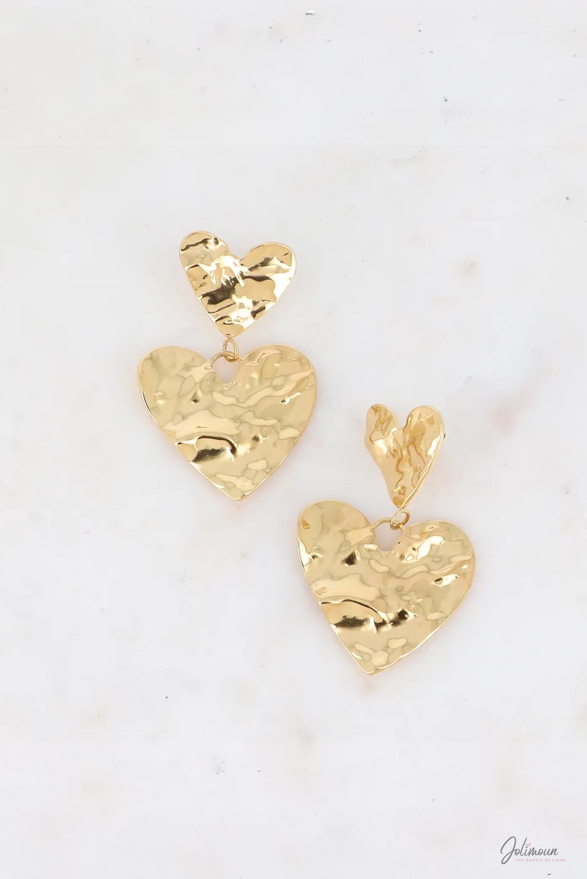 Boucles Double Cœur Martelé – Boucles d’oreilles dorées cœurs pendants