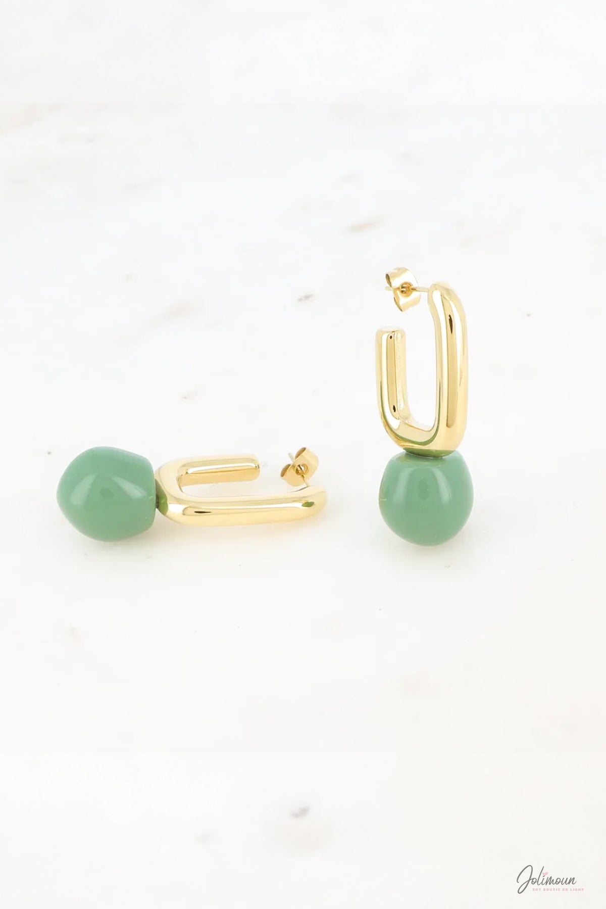 Boucles Perle verte – Boucles d’oreilles dorées maillon U perle verte
