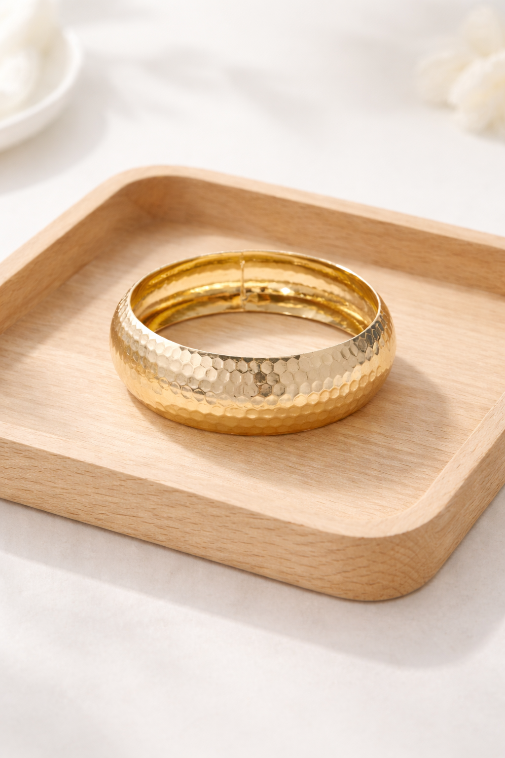 Un jonc doré au fini martelé qui capte la lumière et donne tout de suite du style… pensé pour les poignets plus larges.