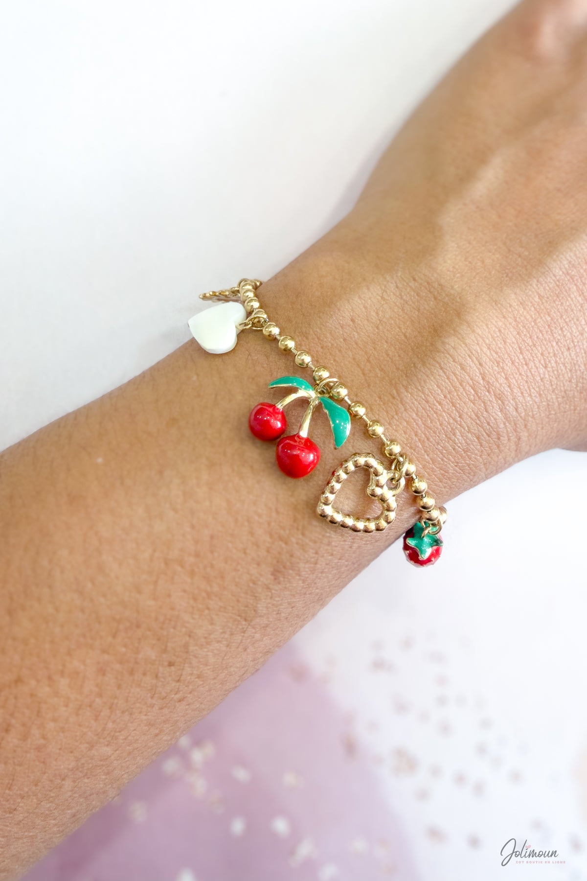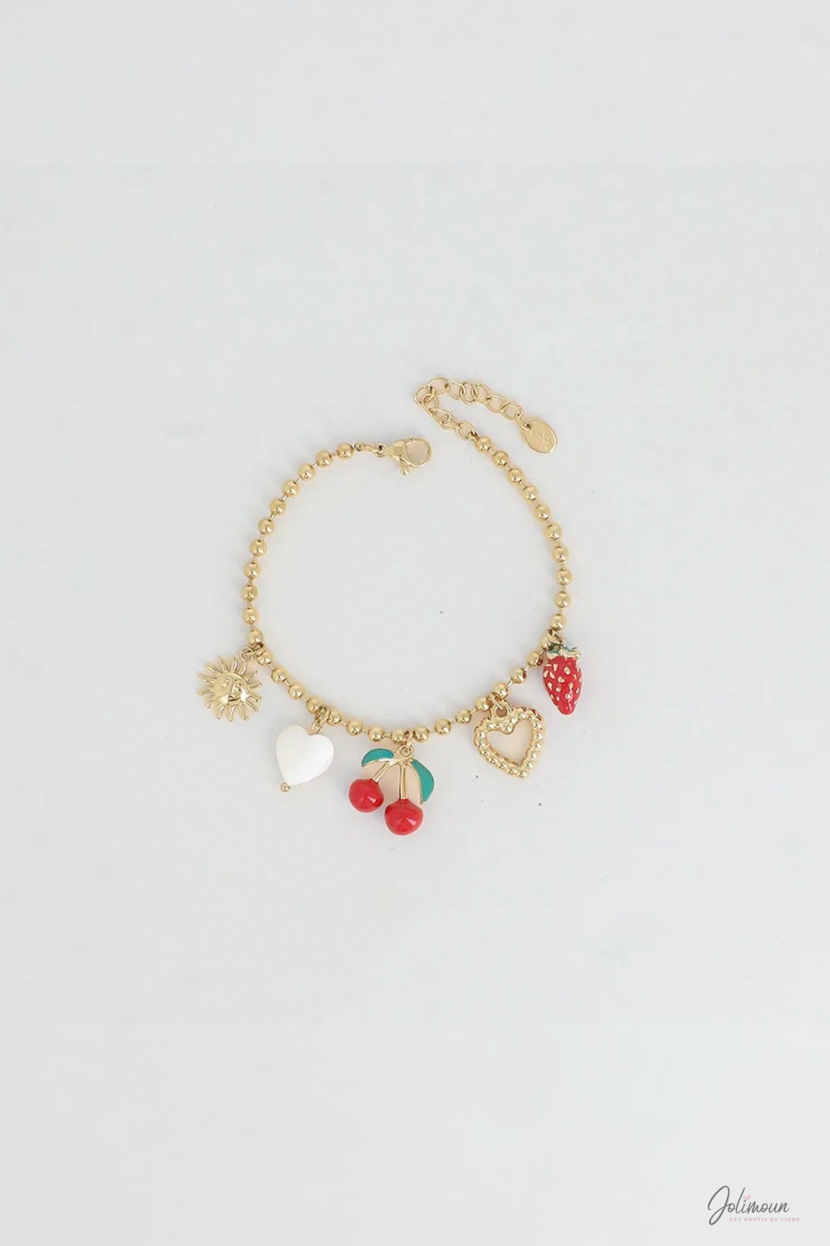 Cerisola - Bracelet chaîne à boules doré pendentifs soleil cœurs cerise fraise émail