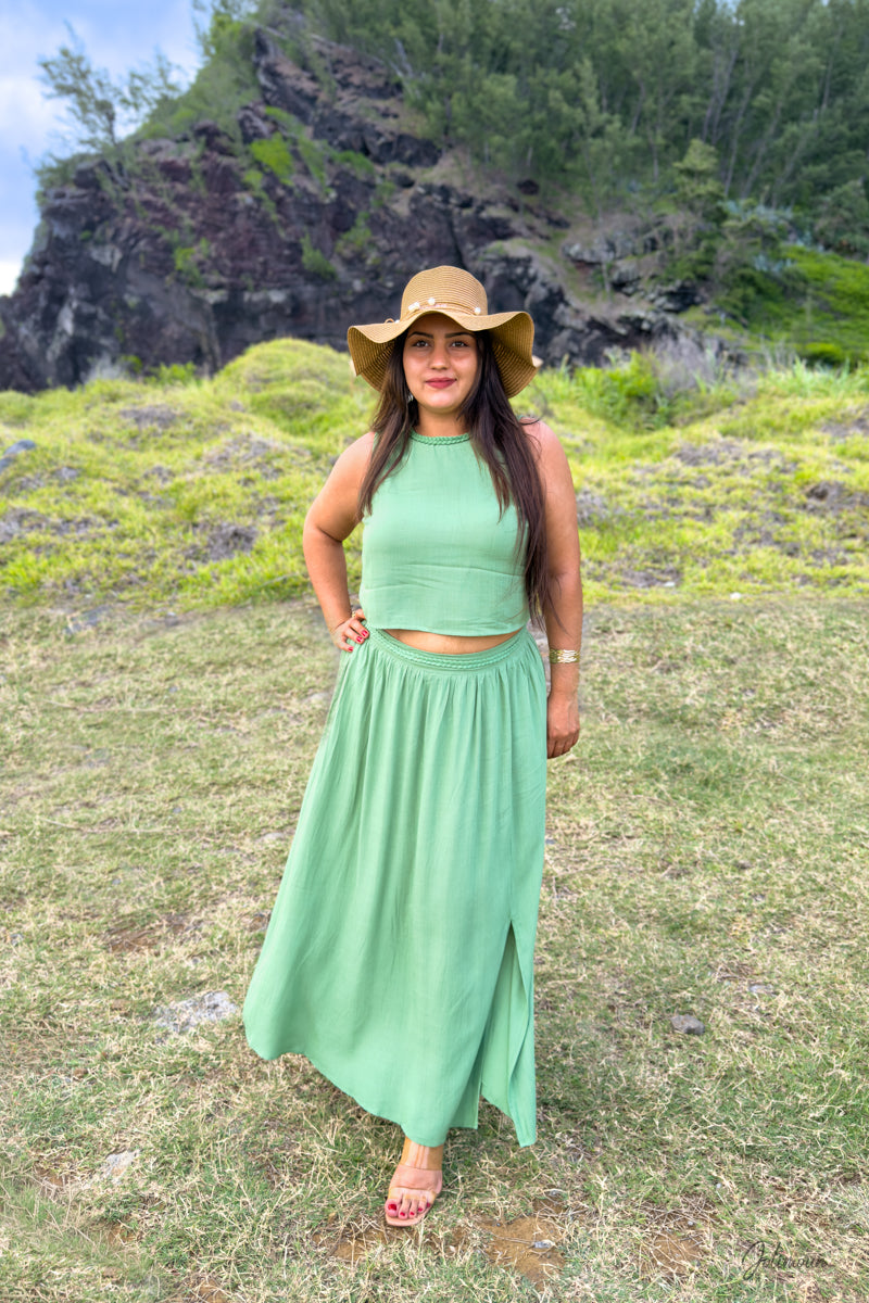 Charlina - Ensemble vert top et jupe longue viscose détails tressés