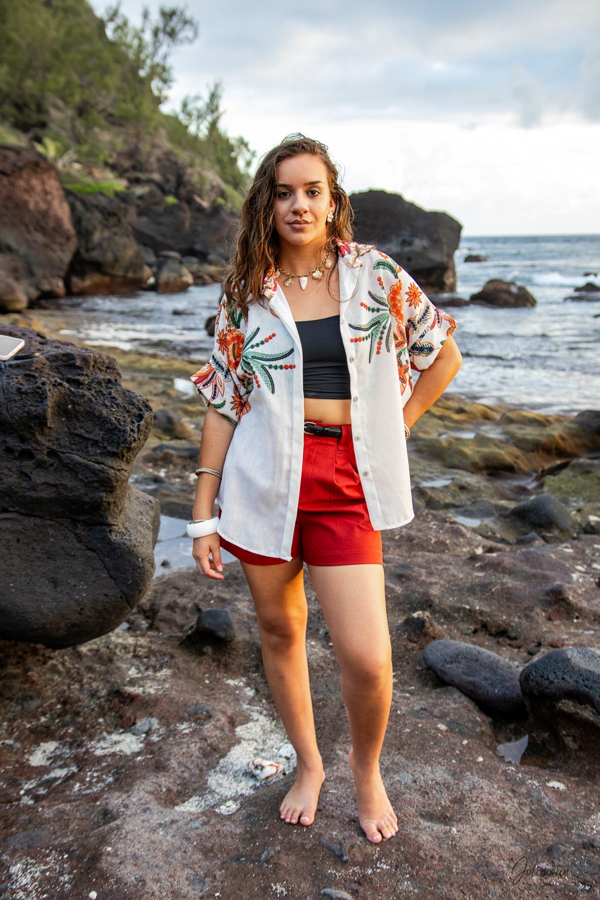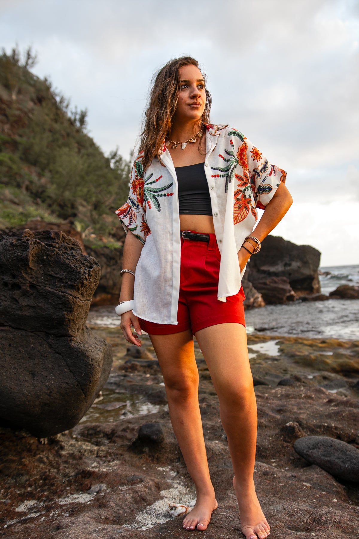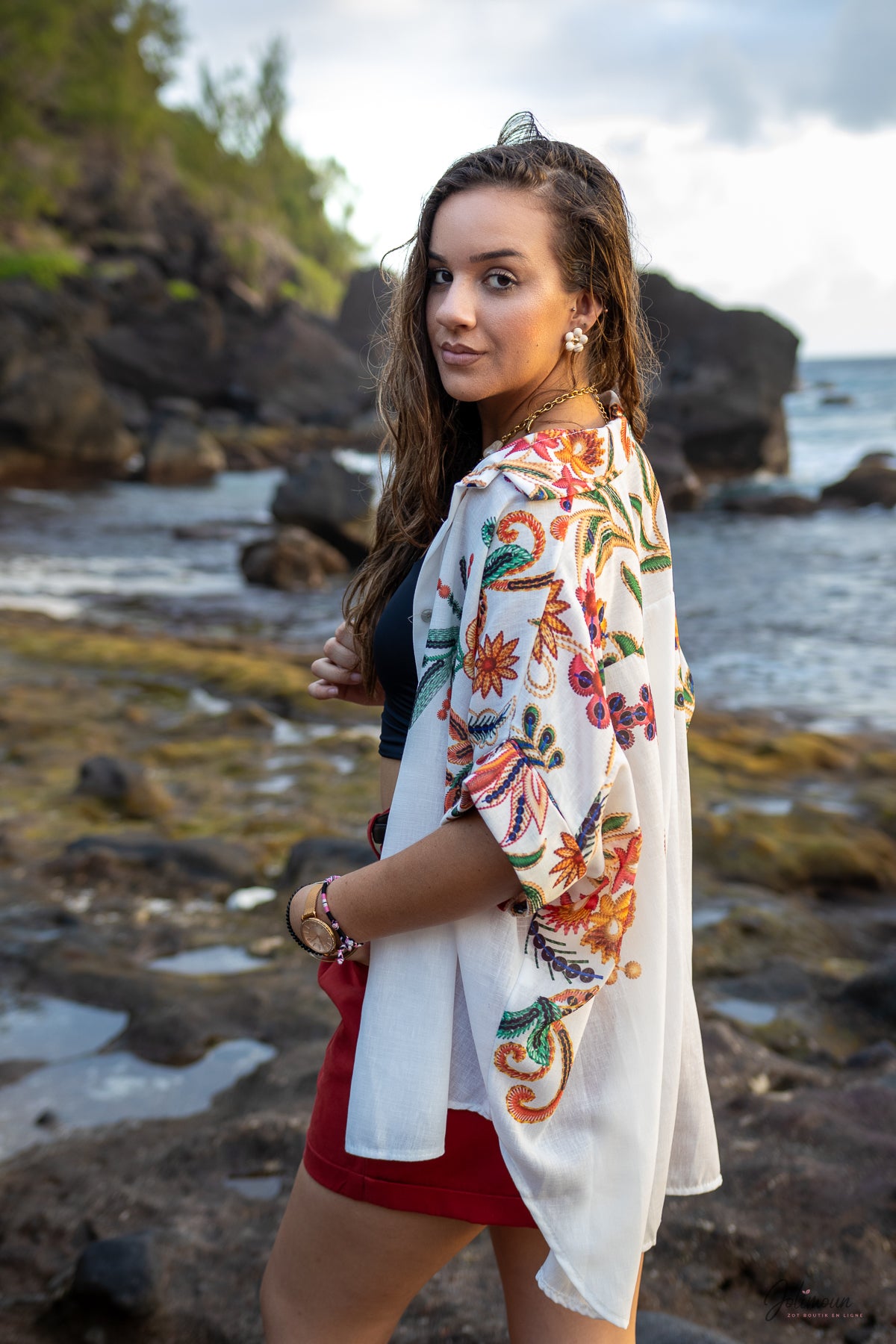 Flora – Chemise blanche imprimée fleurs multicolores manches courtes