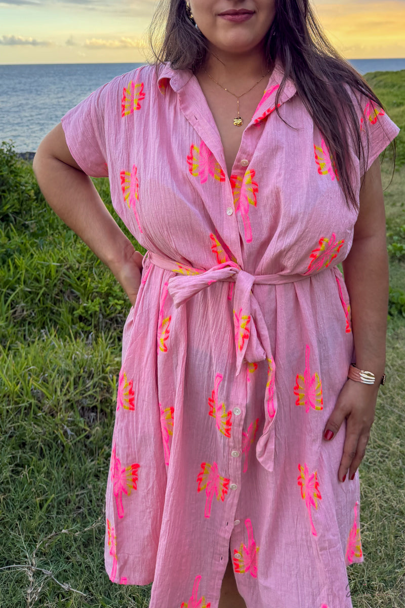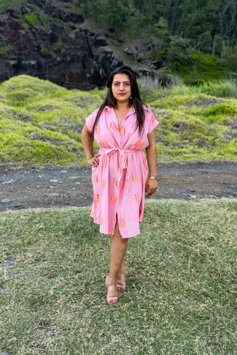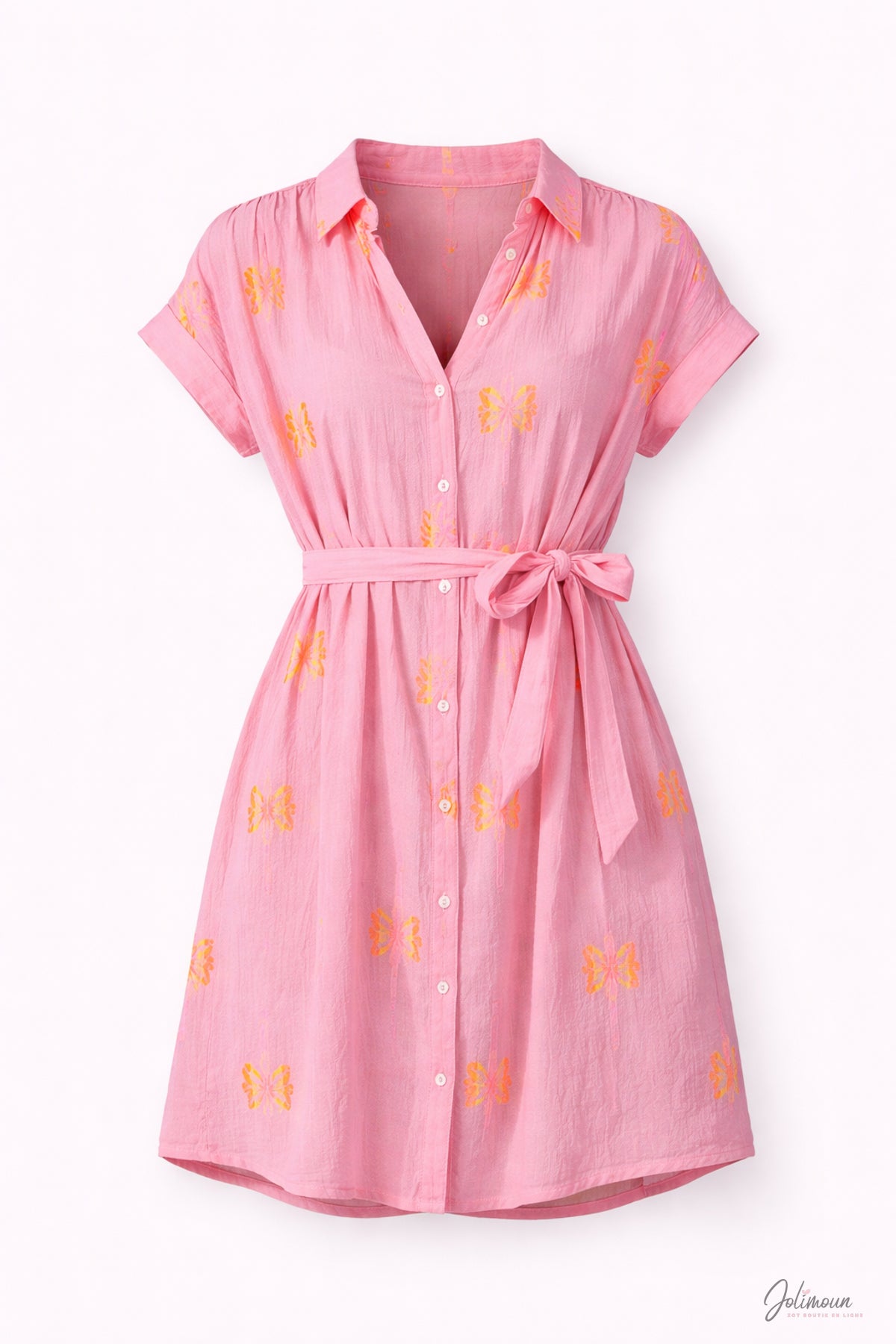 Détails : Robe courte chemise rose en coton jacquard avec motifs papillons ton jaune/orangé. Col chemise, patte de boutonnage sur toute la longueur devant et manches courtes retroussées. Taille élastiquée souple mise en valeur par une ceinture à nouer ton sur ton pour structurer la silhouette. Deux poches discrètes dans les coutures côtés, pratique au quotidien. Bas légèrement arrondi pour une jolie tombée sur les jambes.