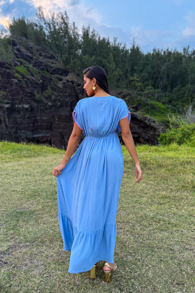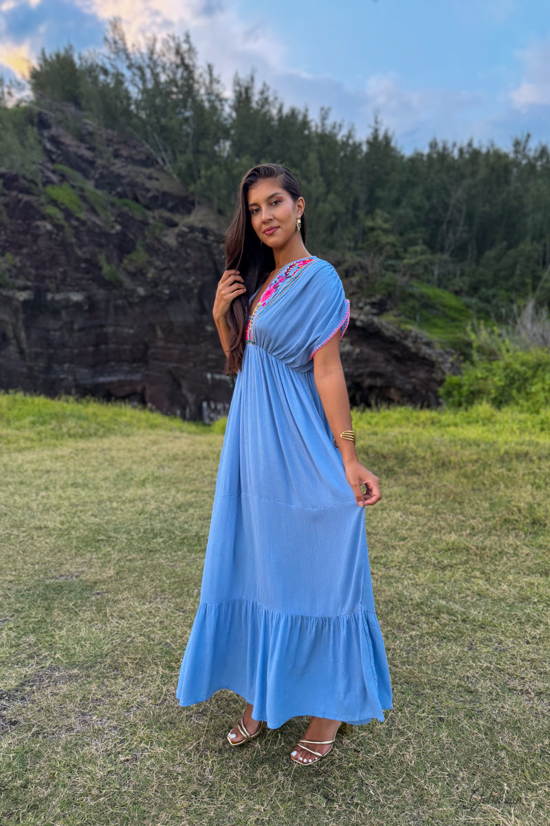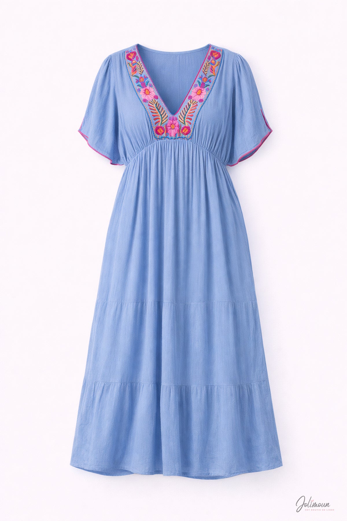 Détails : Robe longue bleue en crêpe de viscose, coupe empire sous la poitrine avec fronces pour une ligne élancée. Décolleté V devant orné d’une large bande brodée de fleurs multicolores soulignée d’un liseré rose. Manches courtes façon manches papillon pour un tombé aérien sur les bras. Jupe longue à panneaux avec effet de volants pour un mouvement fluide à chaque pas. Finition contrastée sur le bord des manches pour rappeler les broderies du décolleté.