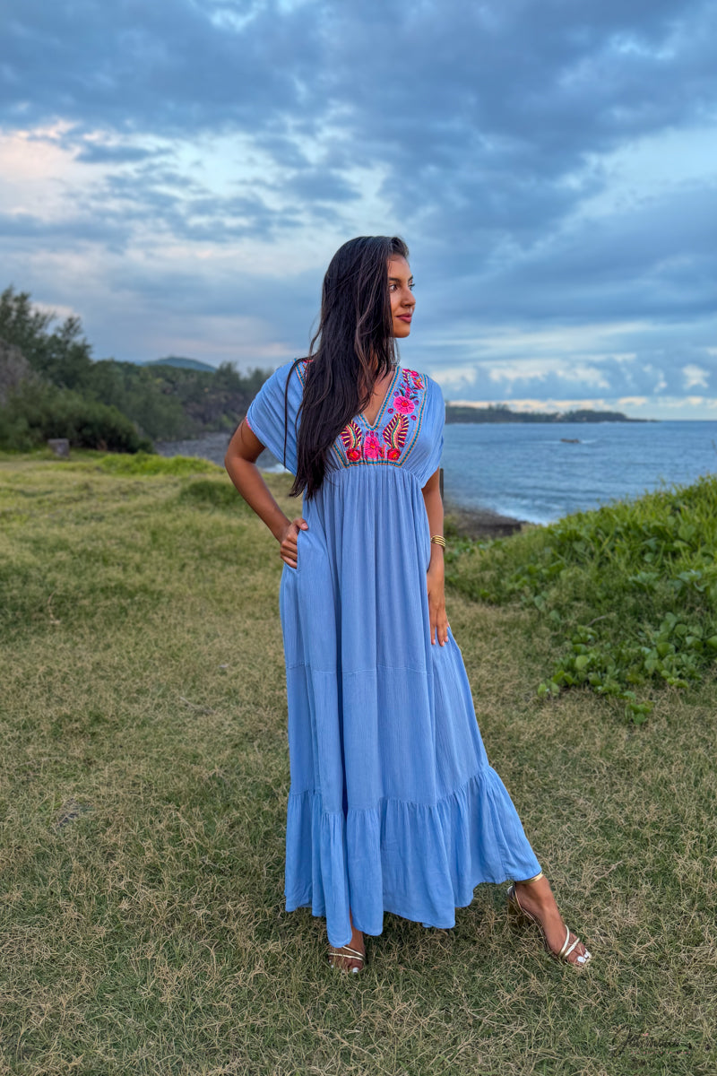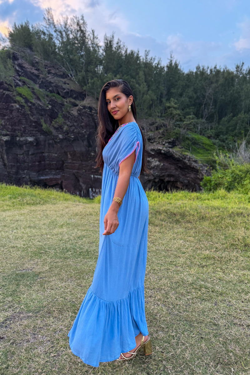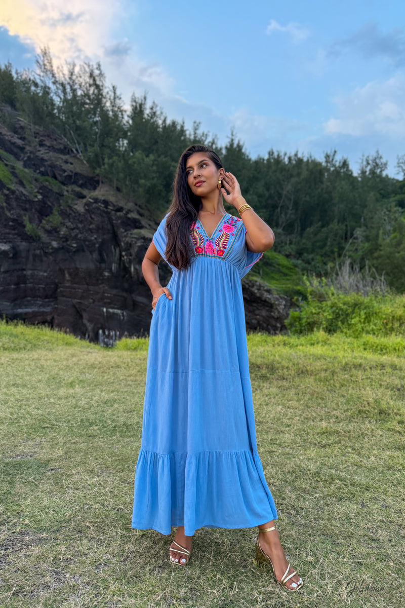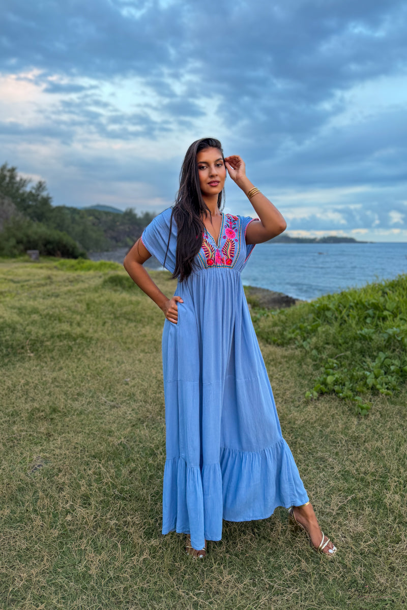 Détails : Robe longue bleue en crêpe de viscose, coupe empire sous la poitrine avec fronces pour une ligne élancée. Décolleté V devant orné d’une large bande brodée de fleurs multicolores soulignée d’un liseré rose. Manches courtes façon manches papillon pour un tombé aérien sur les bras. Jupe longue à panneaux avec effet de volants pour un mouvement fluide à chaque pas. Finition contrastée sur le bord des manches pour rappeler les broderies du décolleté.