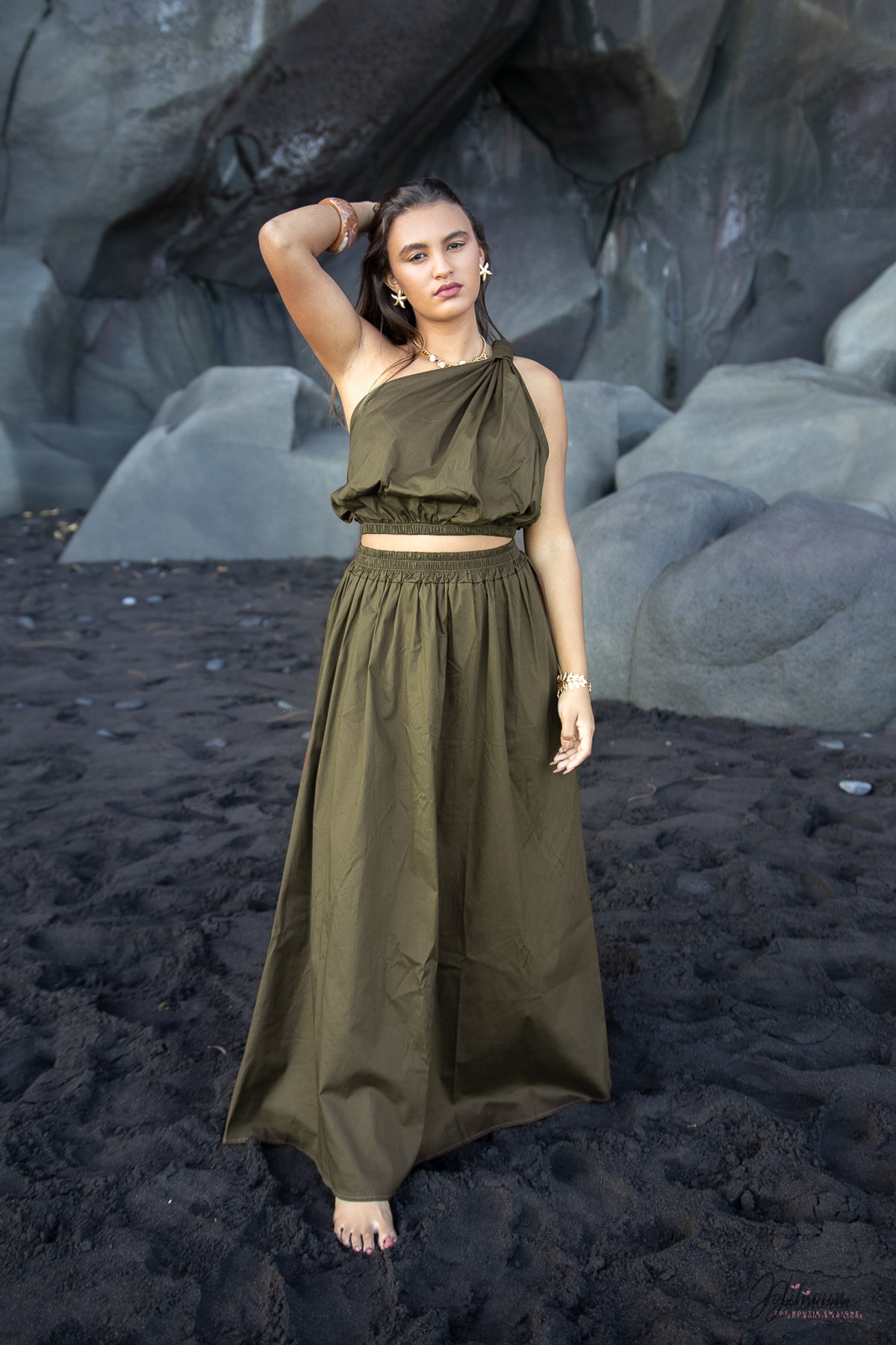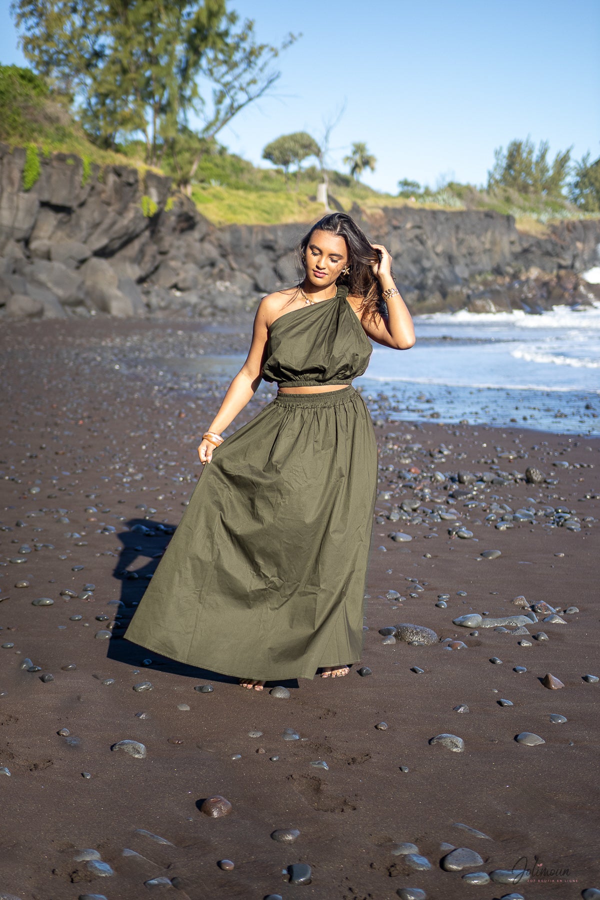 Iséa- Ensemble Kaki jupe longue avec crop top asymétrique