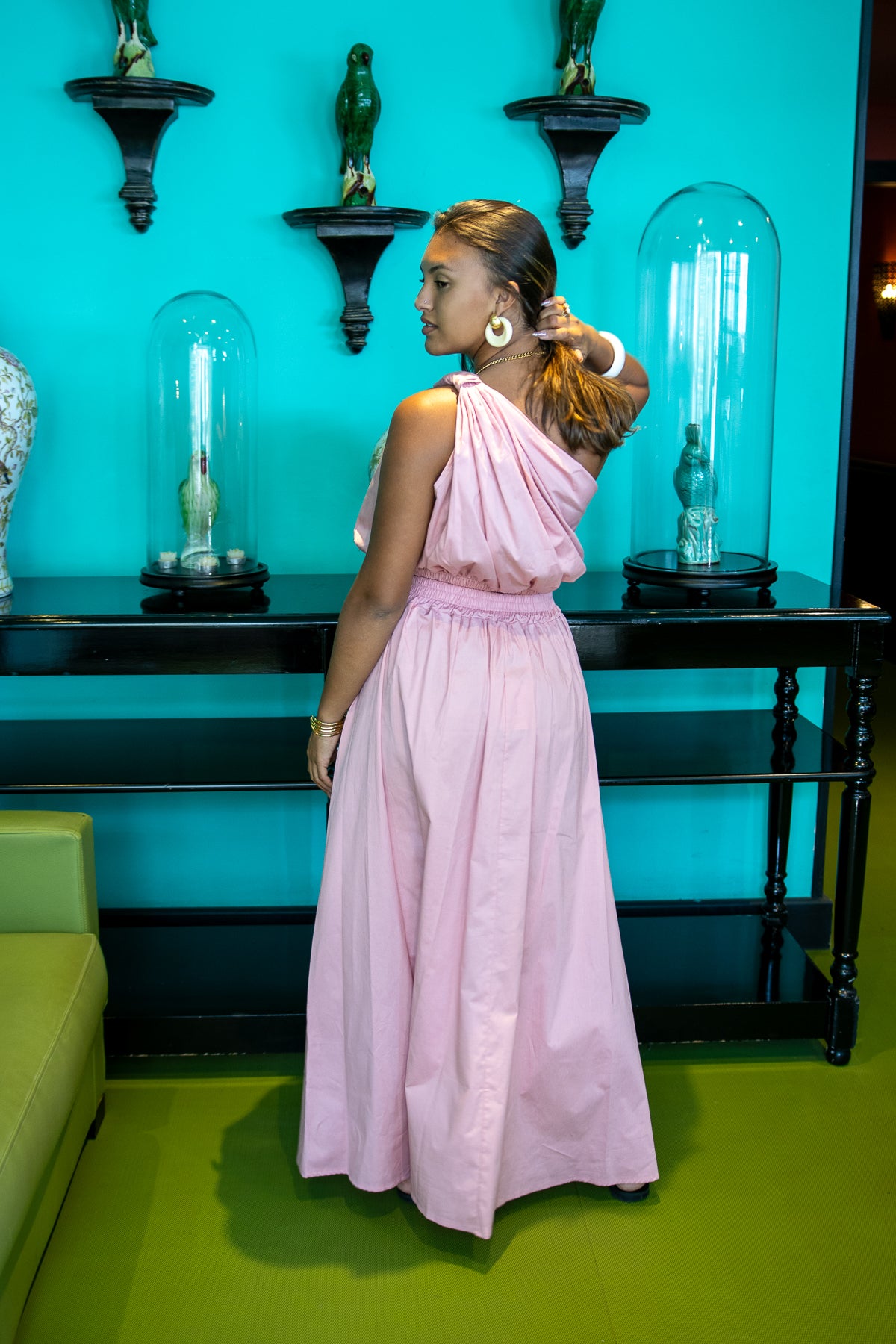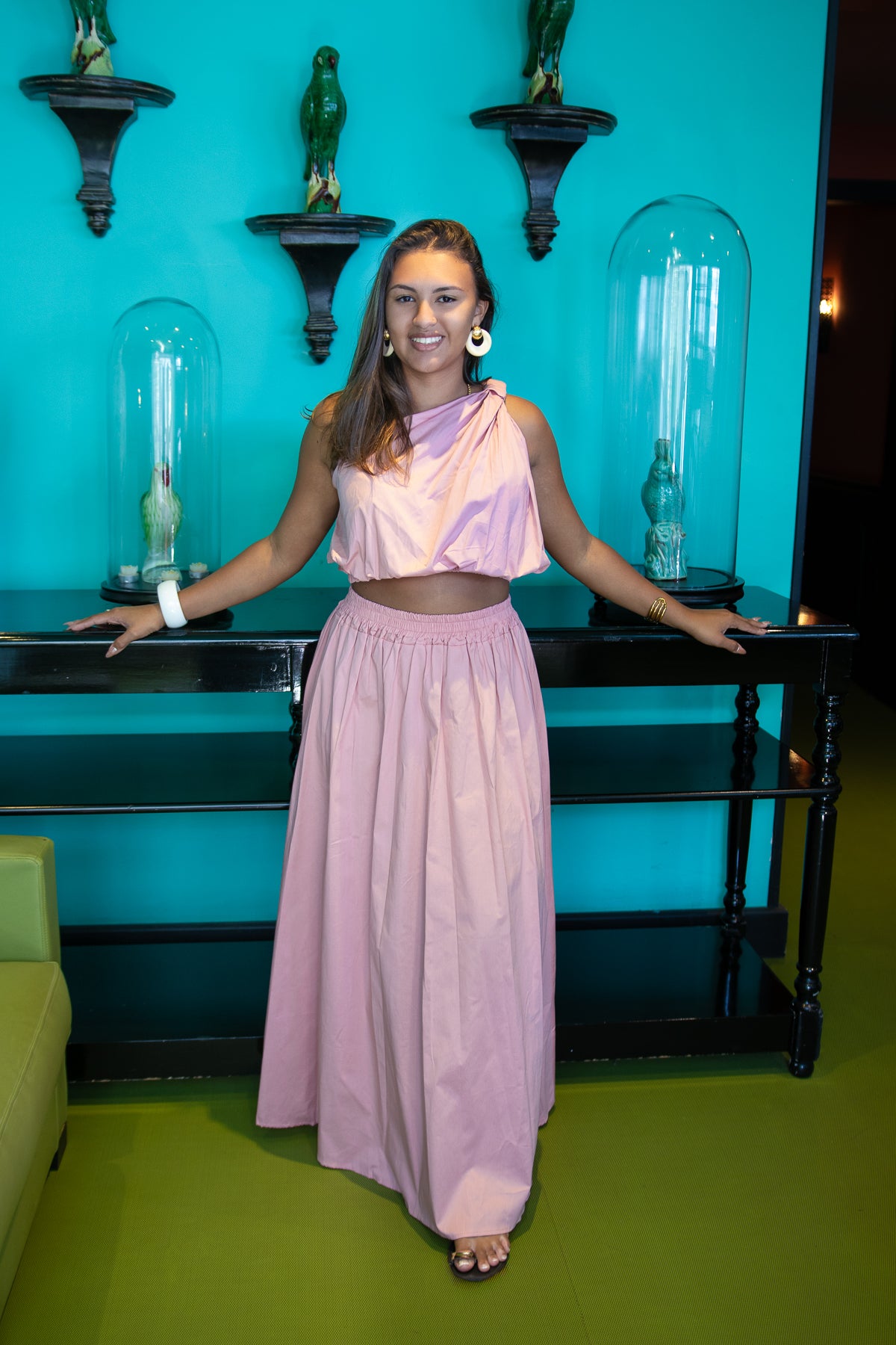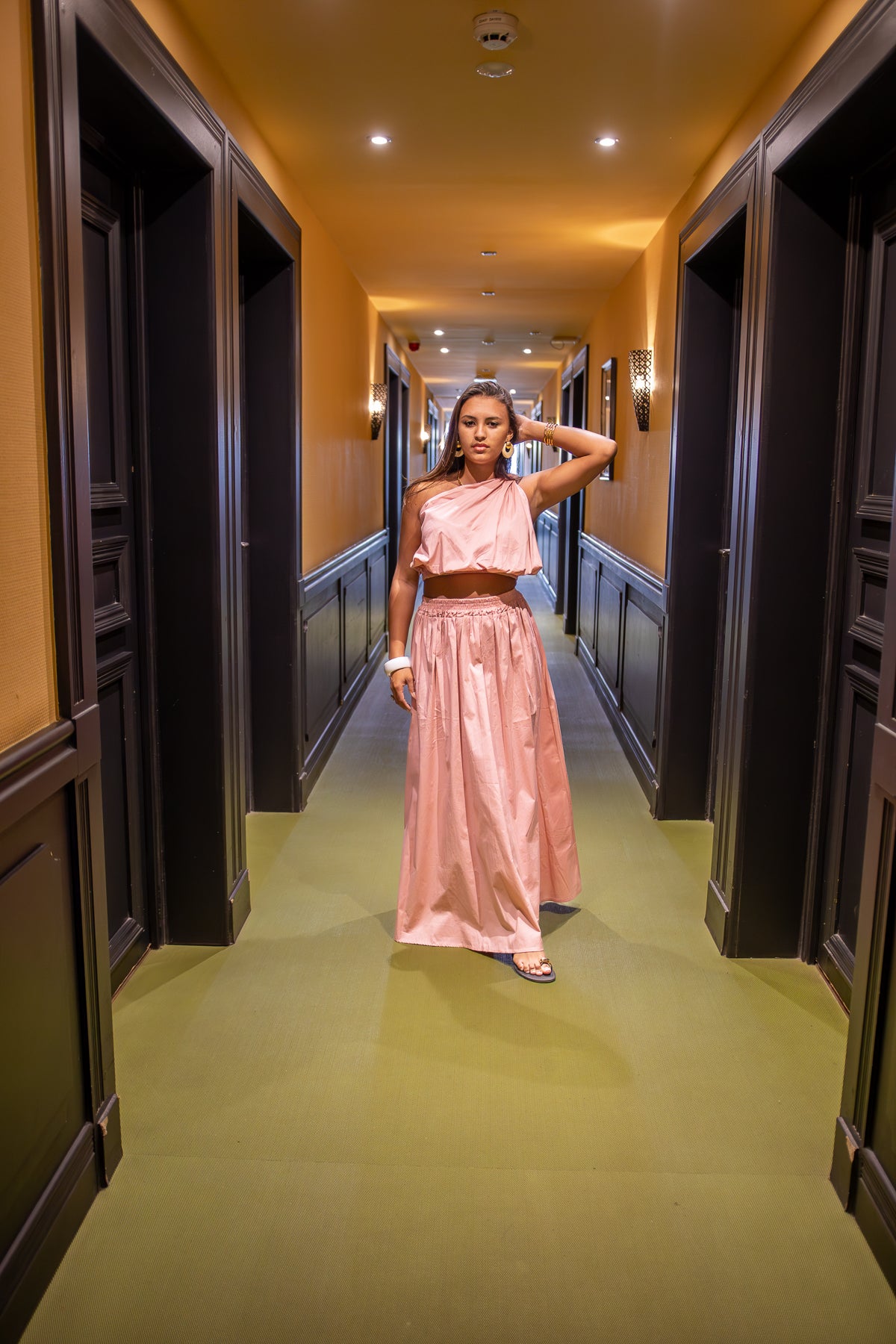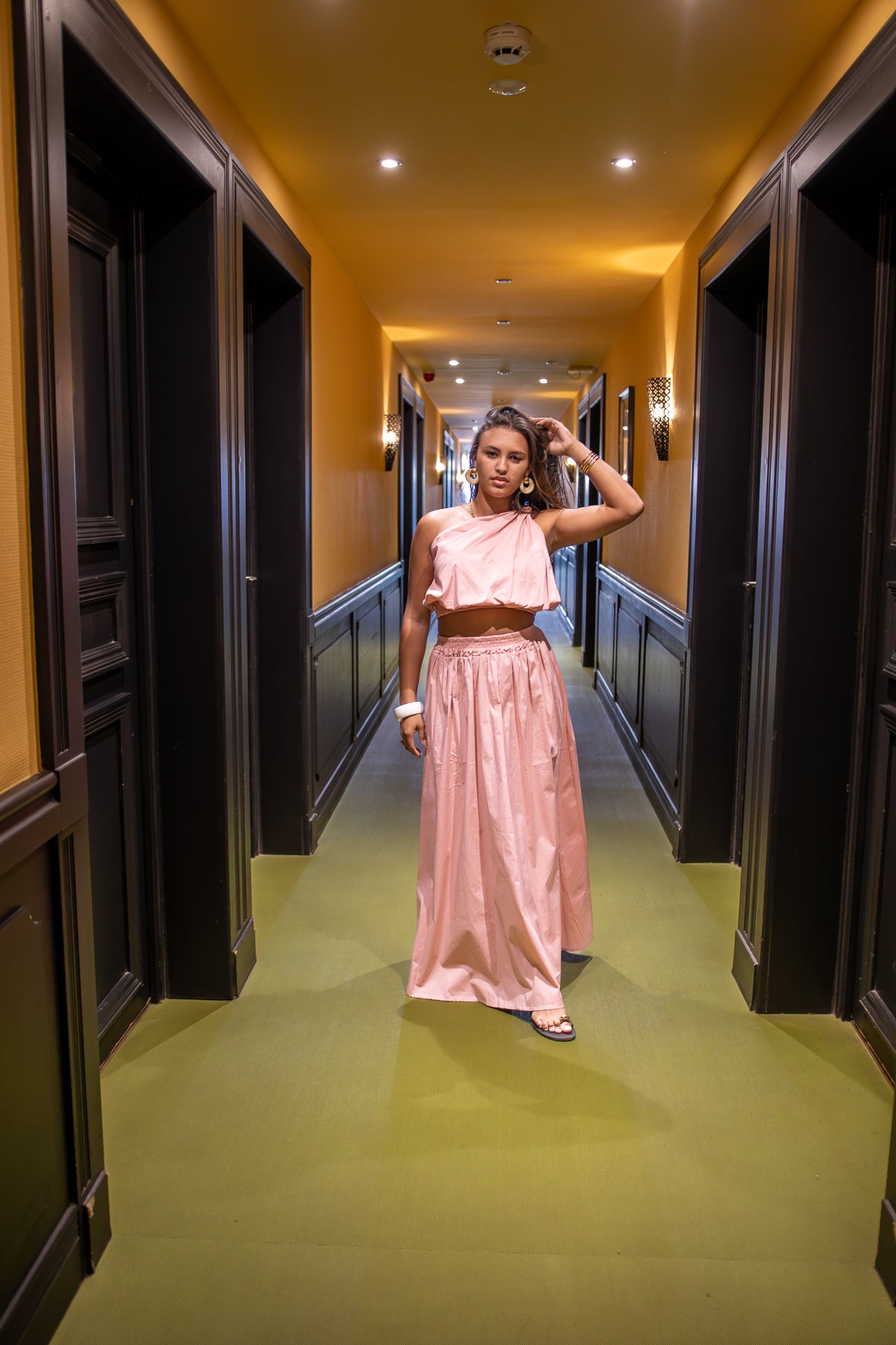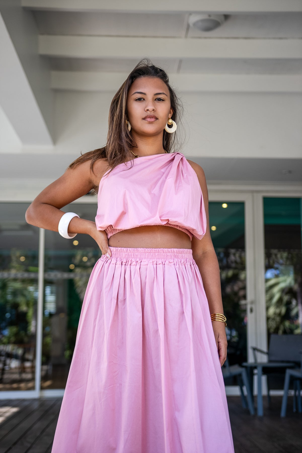 Iséa- Ensemble rose jupe longue avec crop top asymétrique