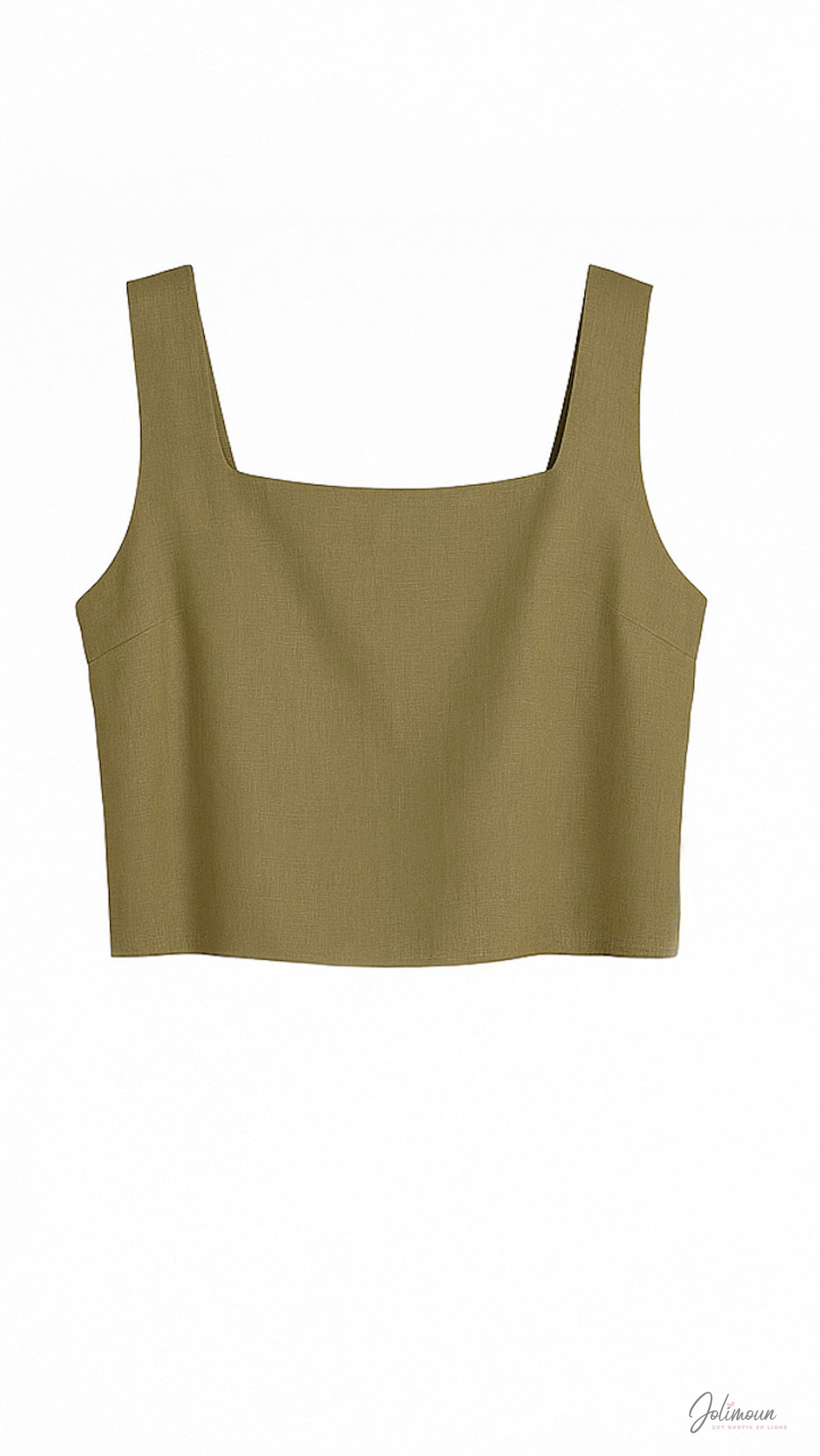 Un top structuré à l’encolure carrée qui flatte la silhouette et s’adapte à toutes les occasions. Grâce à sa coupe ajustée et sa longueur parfaite, il peut se porter seul ou en ensemble avec le pantalon assorti pour un look cohérent et féminin.