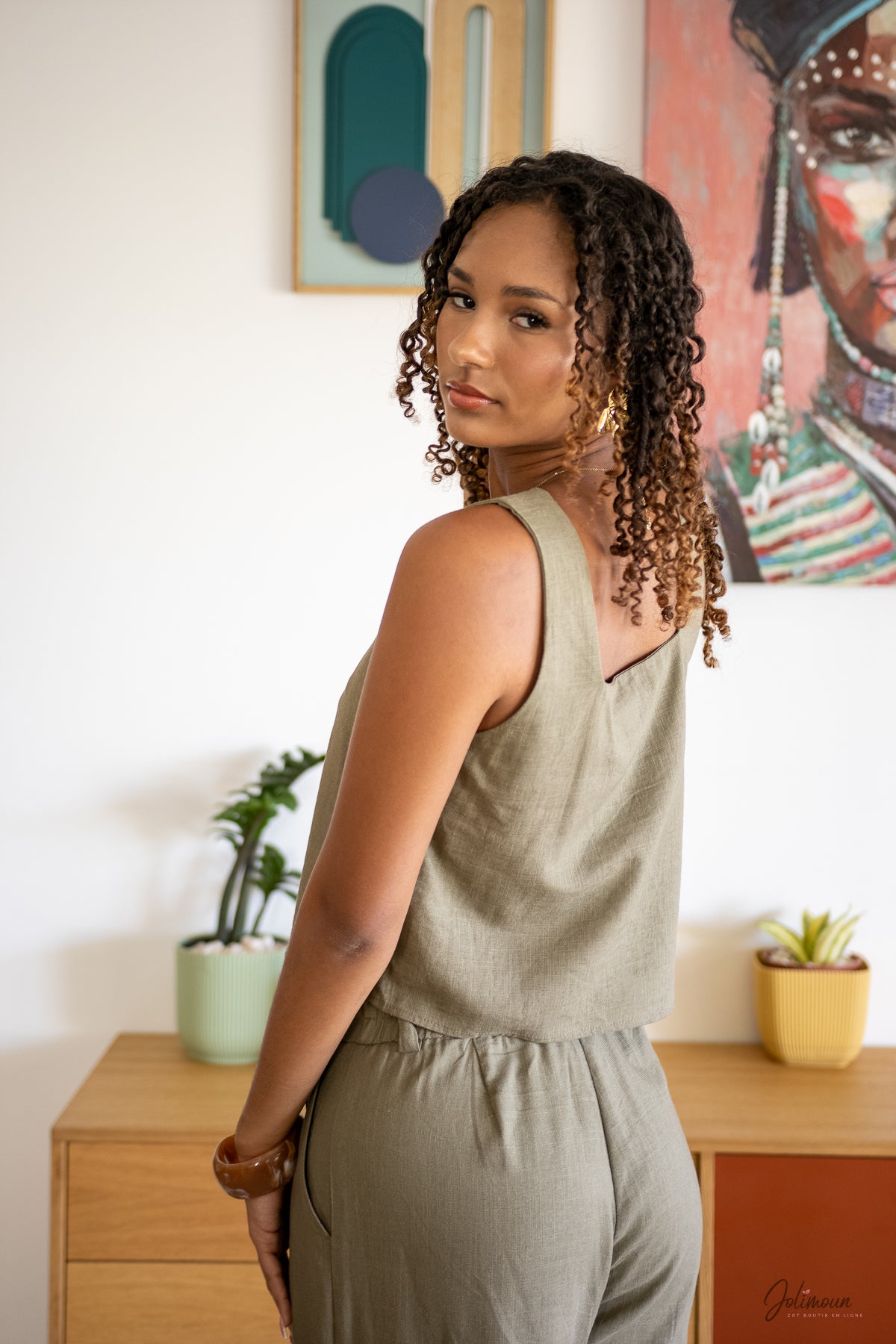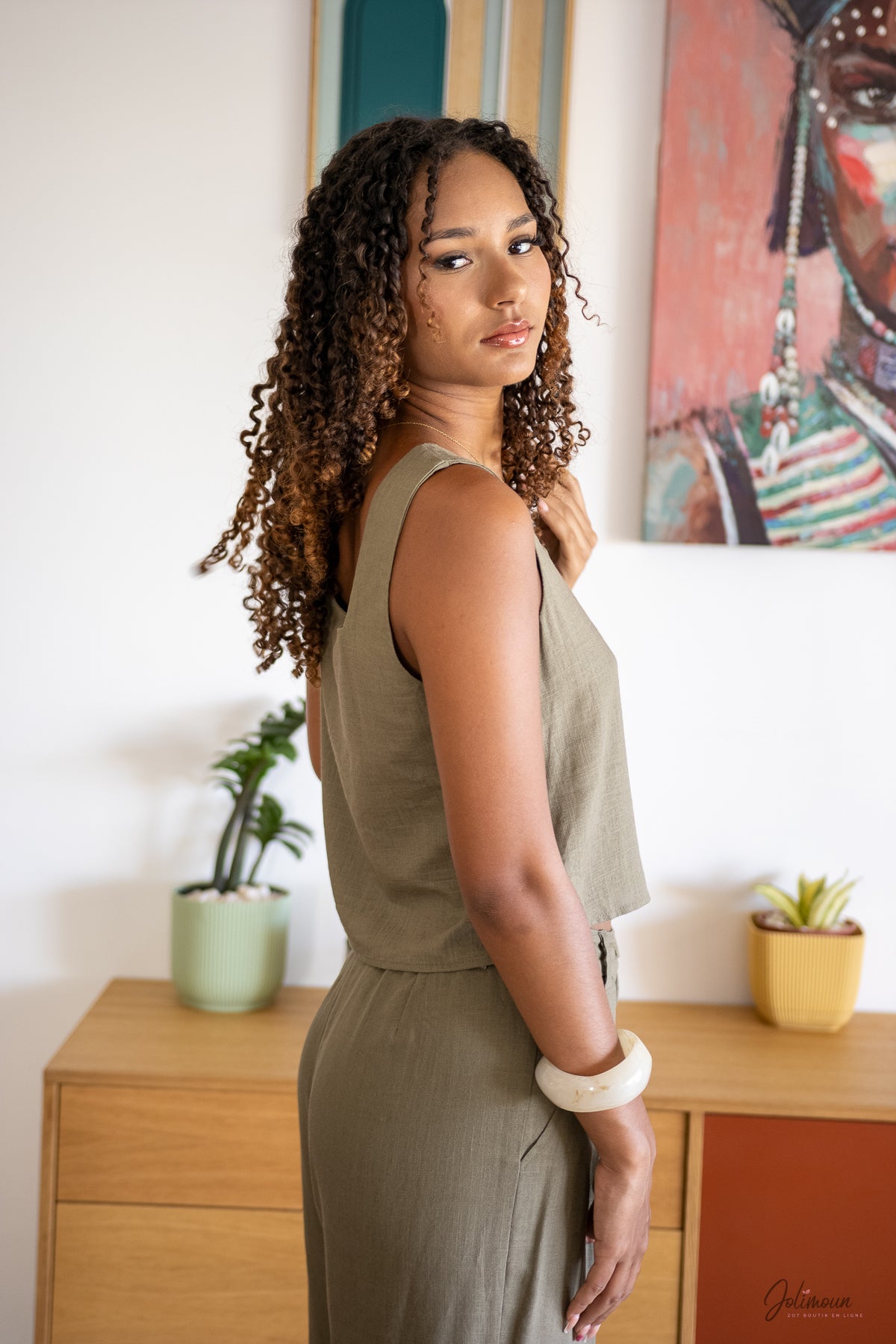 Idéal pour composer un ensemble avec le pantalon Jolia ou pour être porté avec un bas uni. Ce top s’adapte à vos journées en ville, repas en terrasse ou encore une sortie entre amies. Associez-le à une jupe taille haute pour une silhouette élégante, ou un short fluide pour plus de décontraction.
