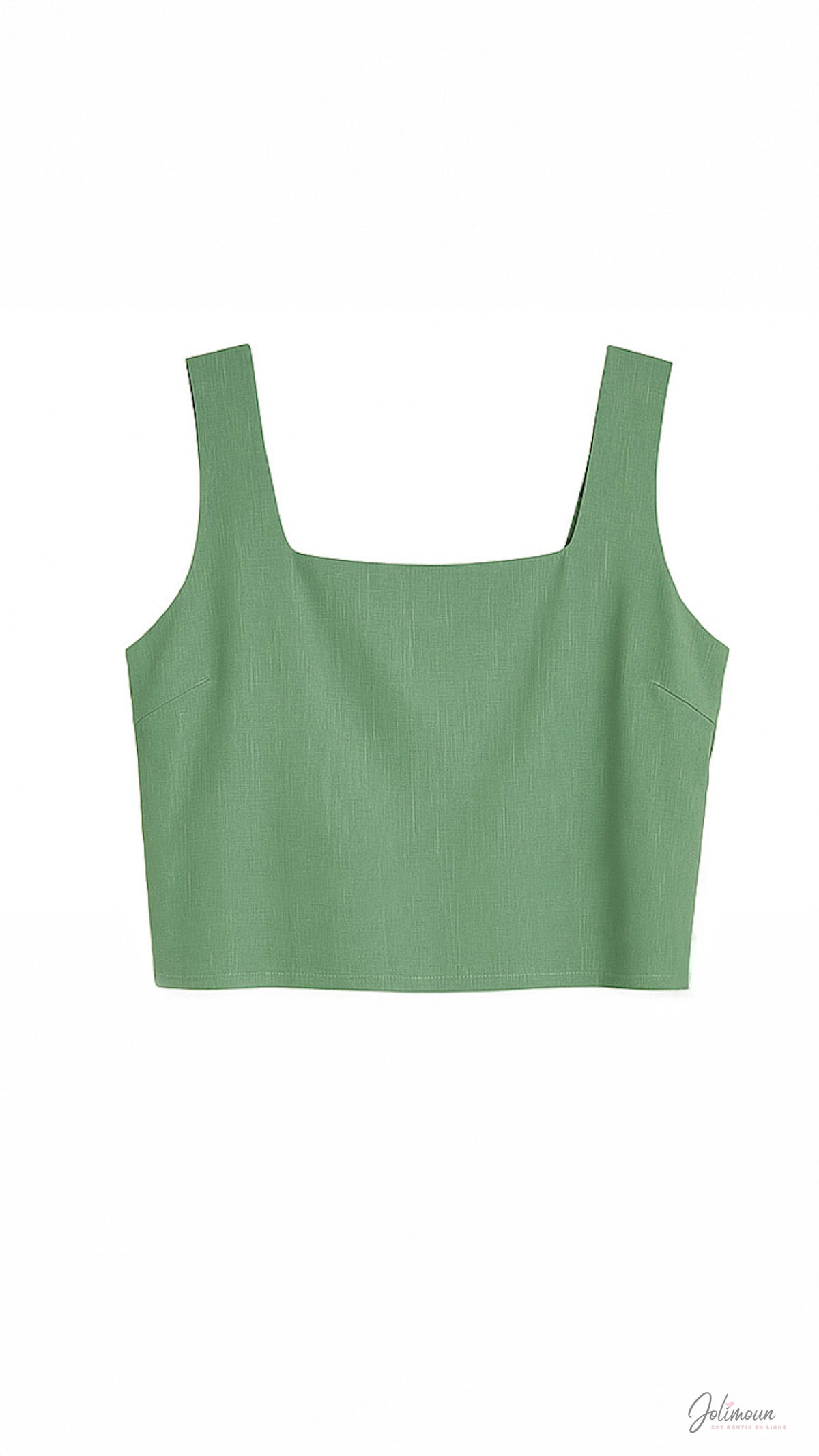 Un top structuré à l’encolure carrée qui flatte la silhouette et s’adapte à toutes les occasions. Grâce à sa coupe ajustée et sa longueur parfaite, il peut se porter seul ou en ensemble avec le pantalon assorti pour un look cohérent et féminin.