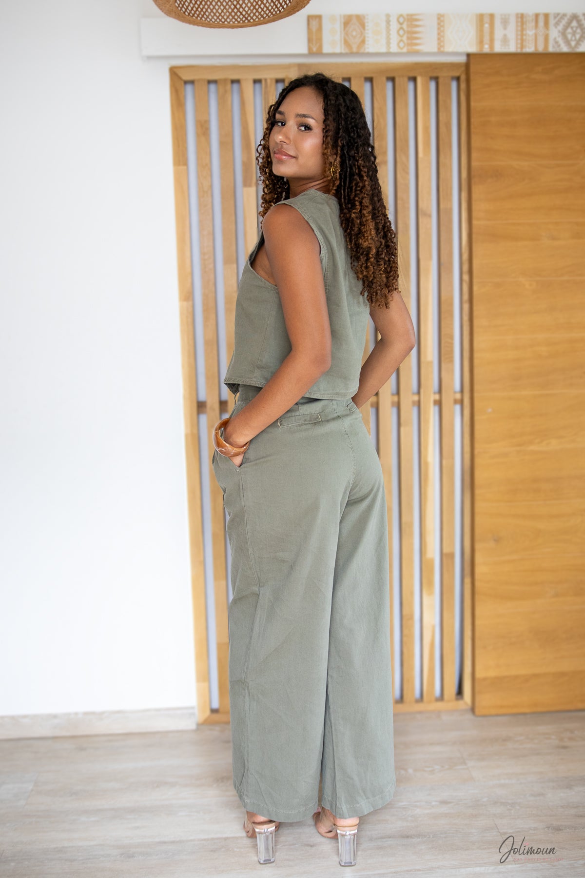 Liana – Ensemble kaki en coton avec pantalon ample taille haute