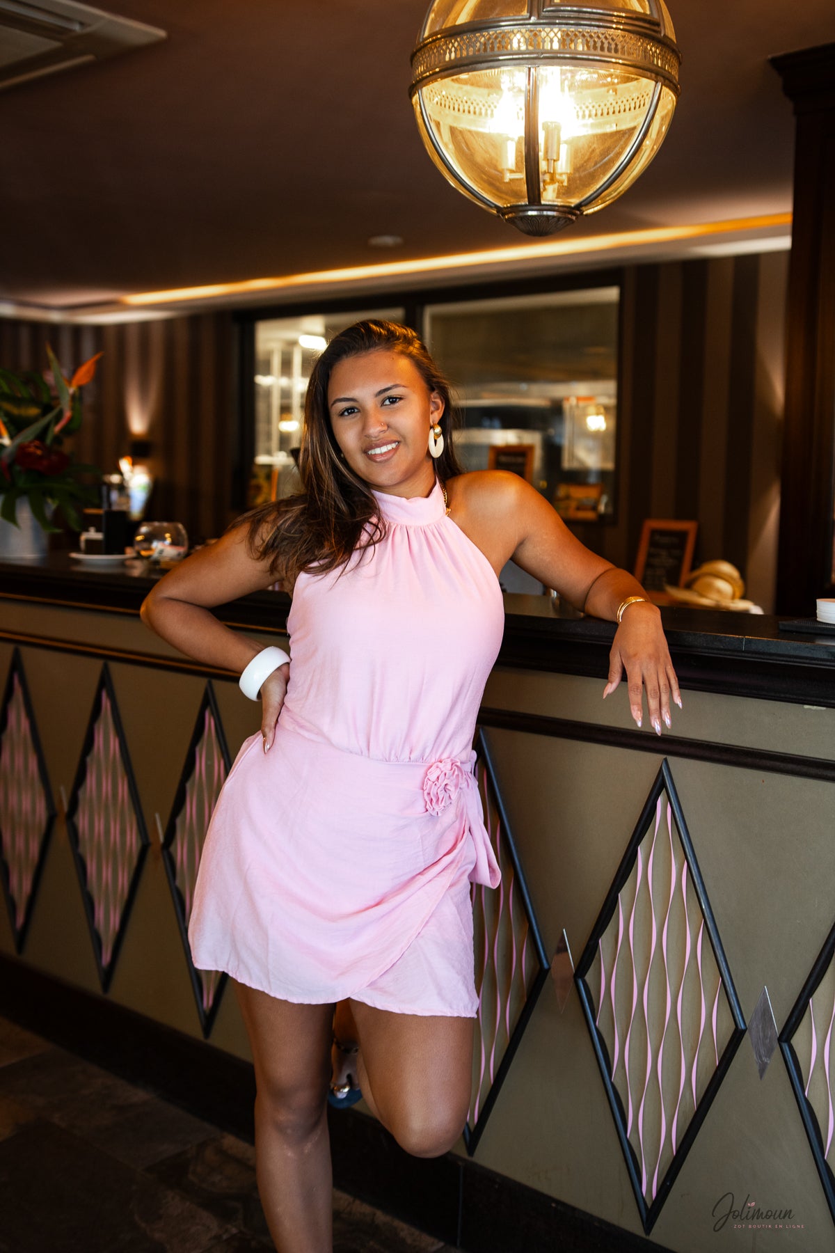 Mya – Robe courte rose col montant dos nu faux portefeuille