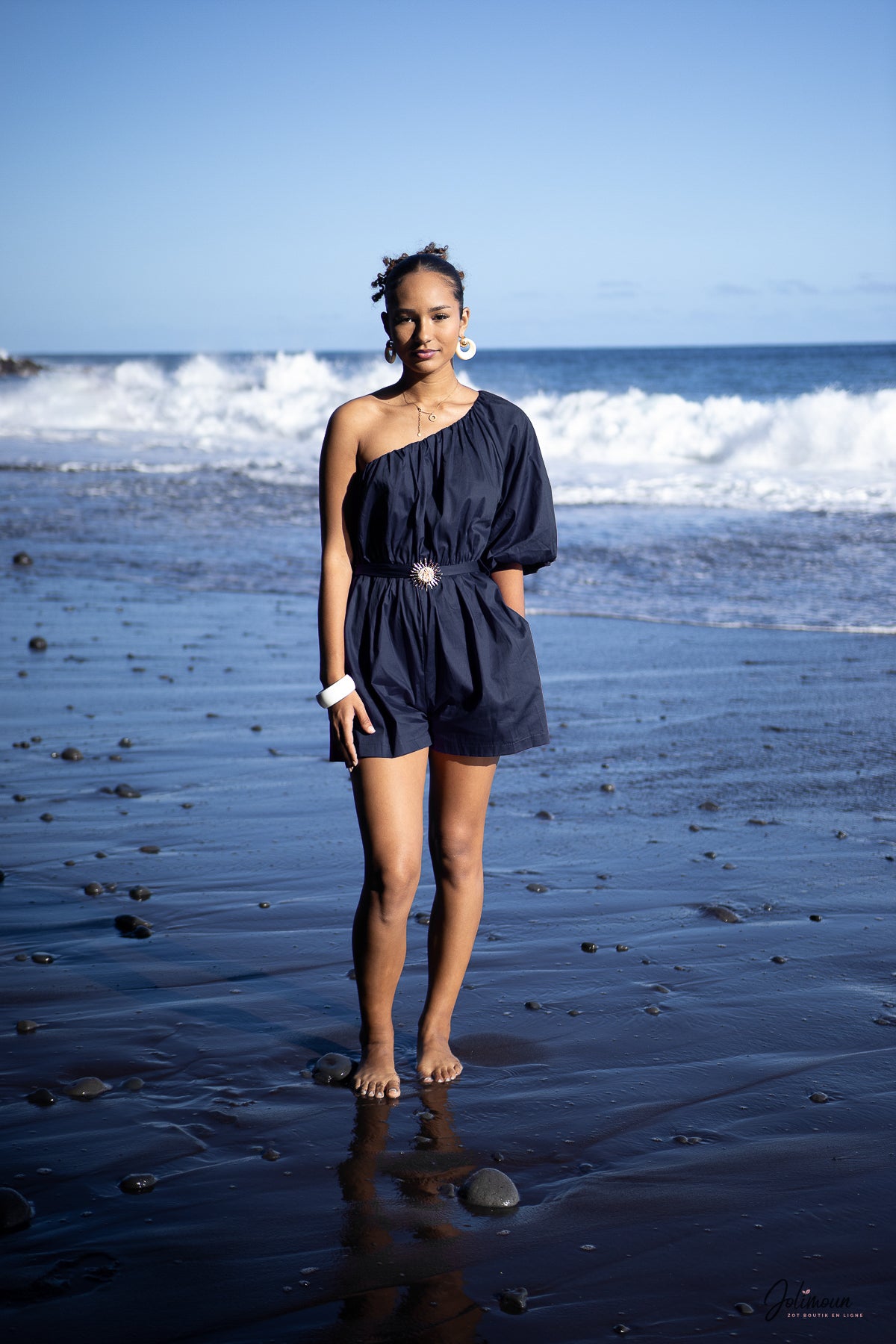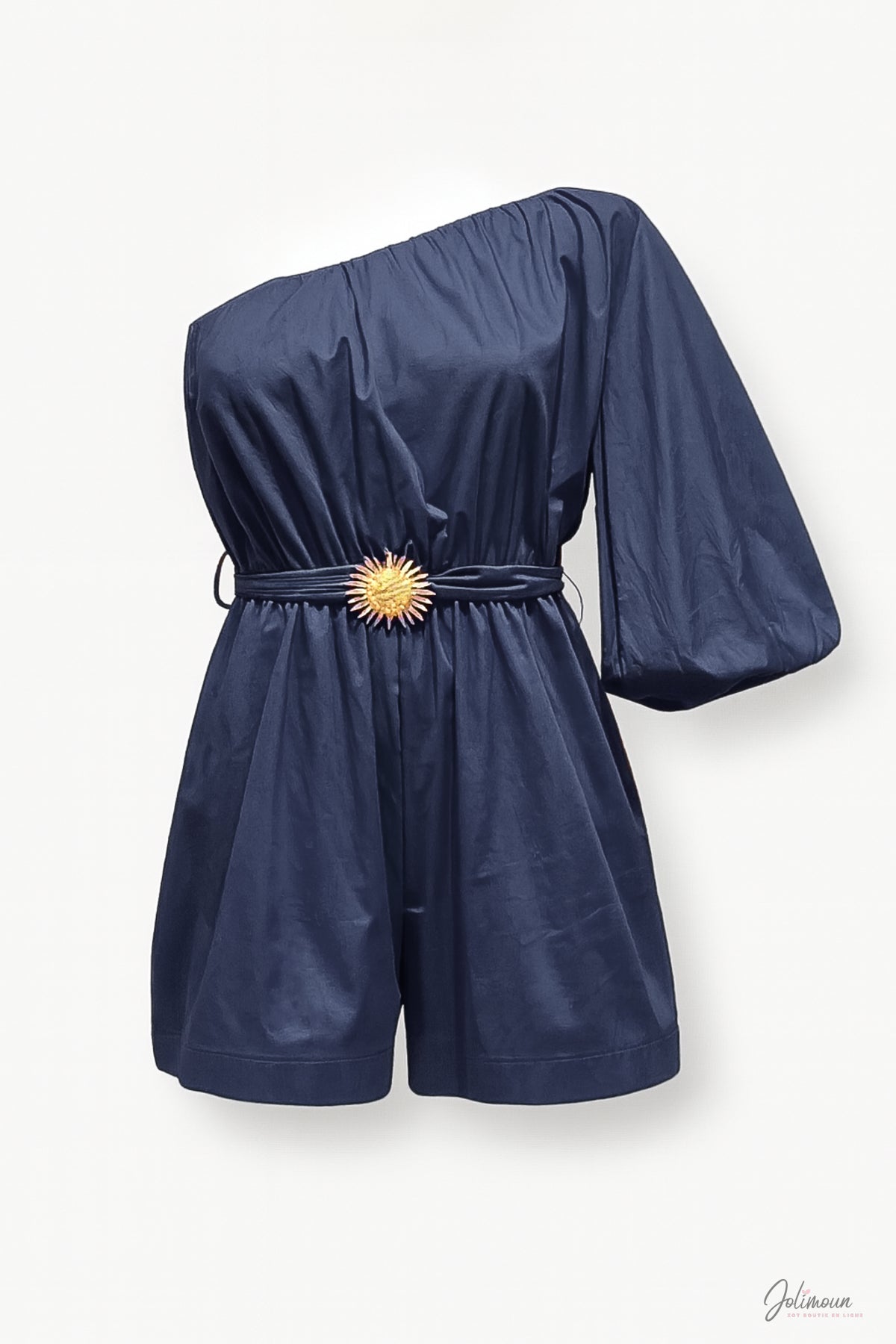 Olivia – Combi-short bleu nuit asymétrique broche soleil amovible