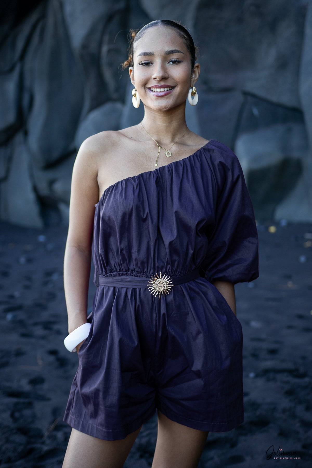 Combi short élégante et féminine avec encolure asymétrique dévoilant une épaule. Manche bouffante pour une touche de volume, taille élastique pour un confort optimal et broche soleil dorée amovible qui apporte la petite touche brillante.