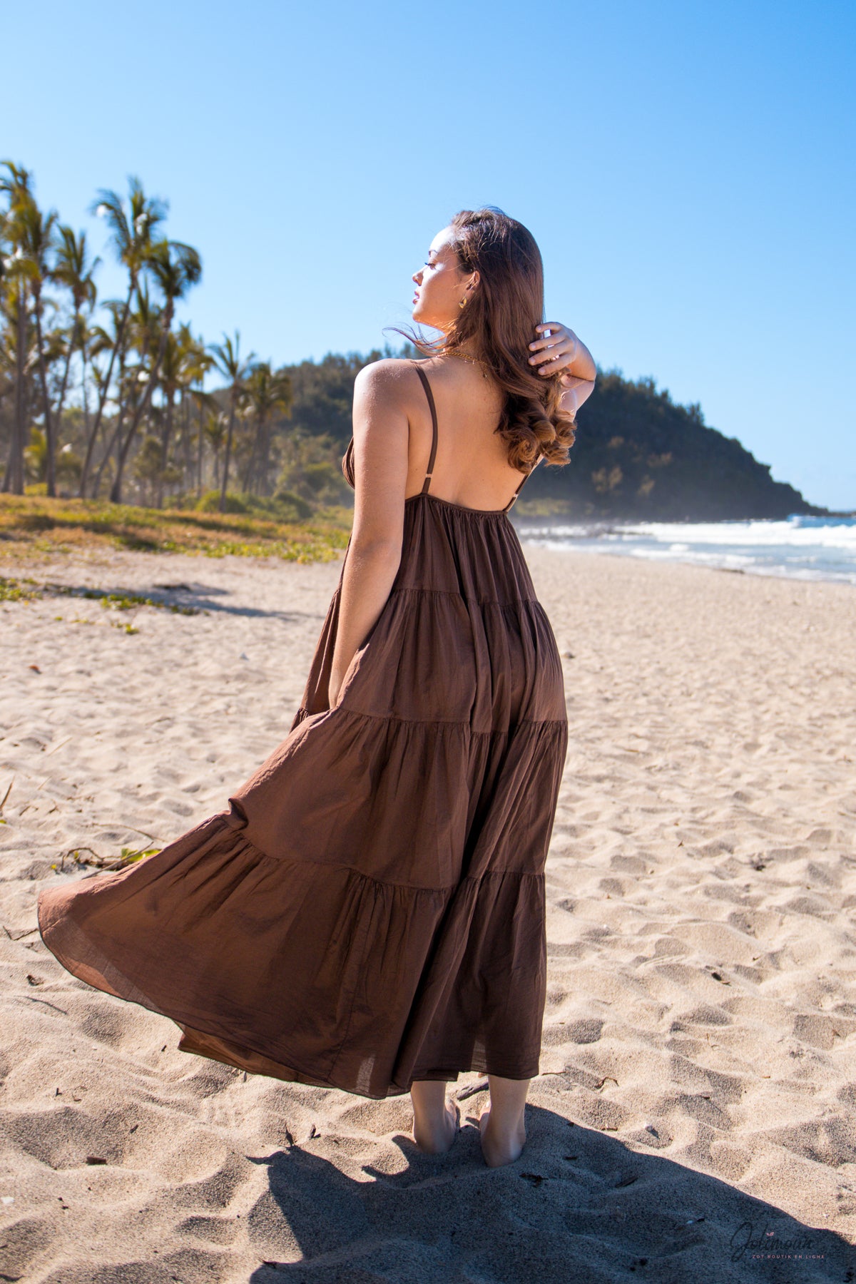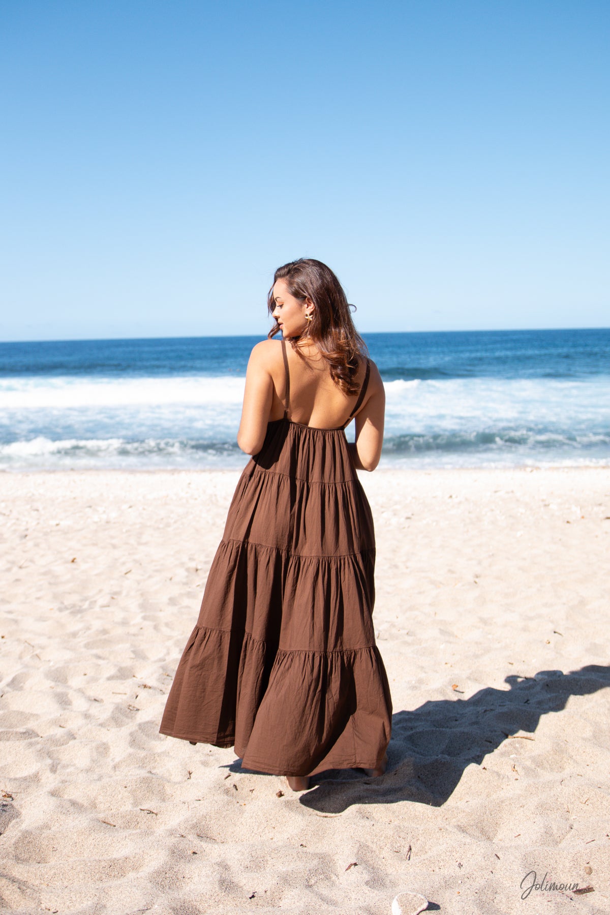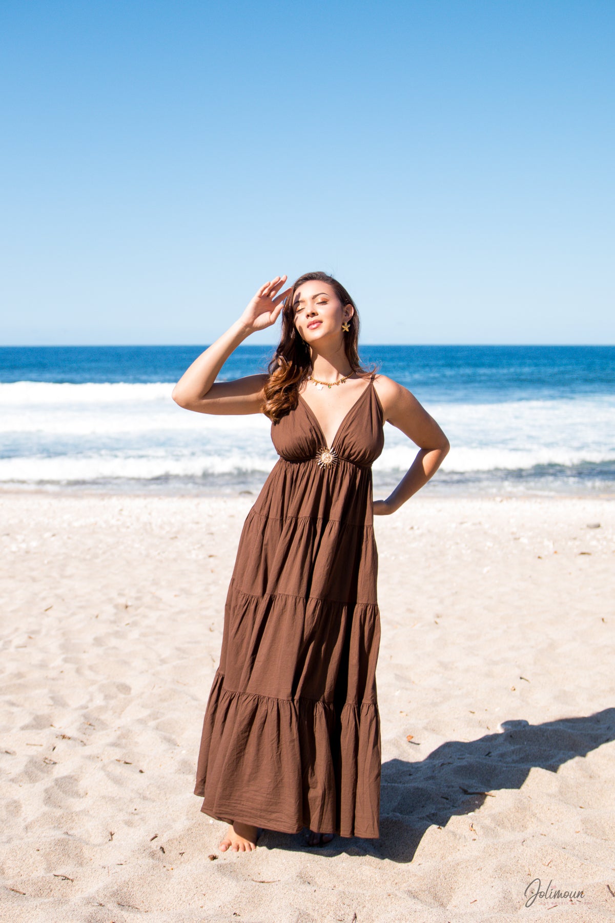 Soléa – 🌞 Robe longue marron en coton à fines bretelles broche soleil
