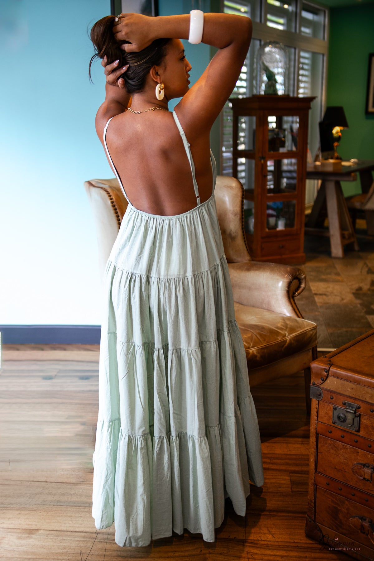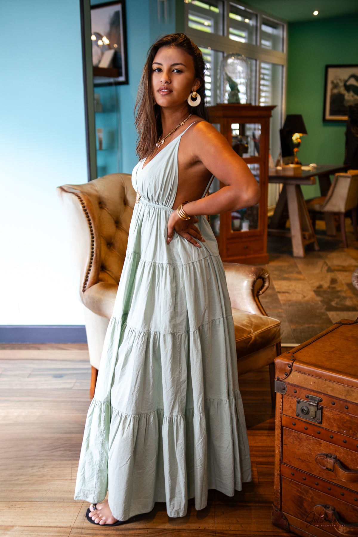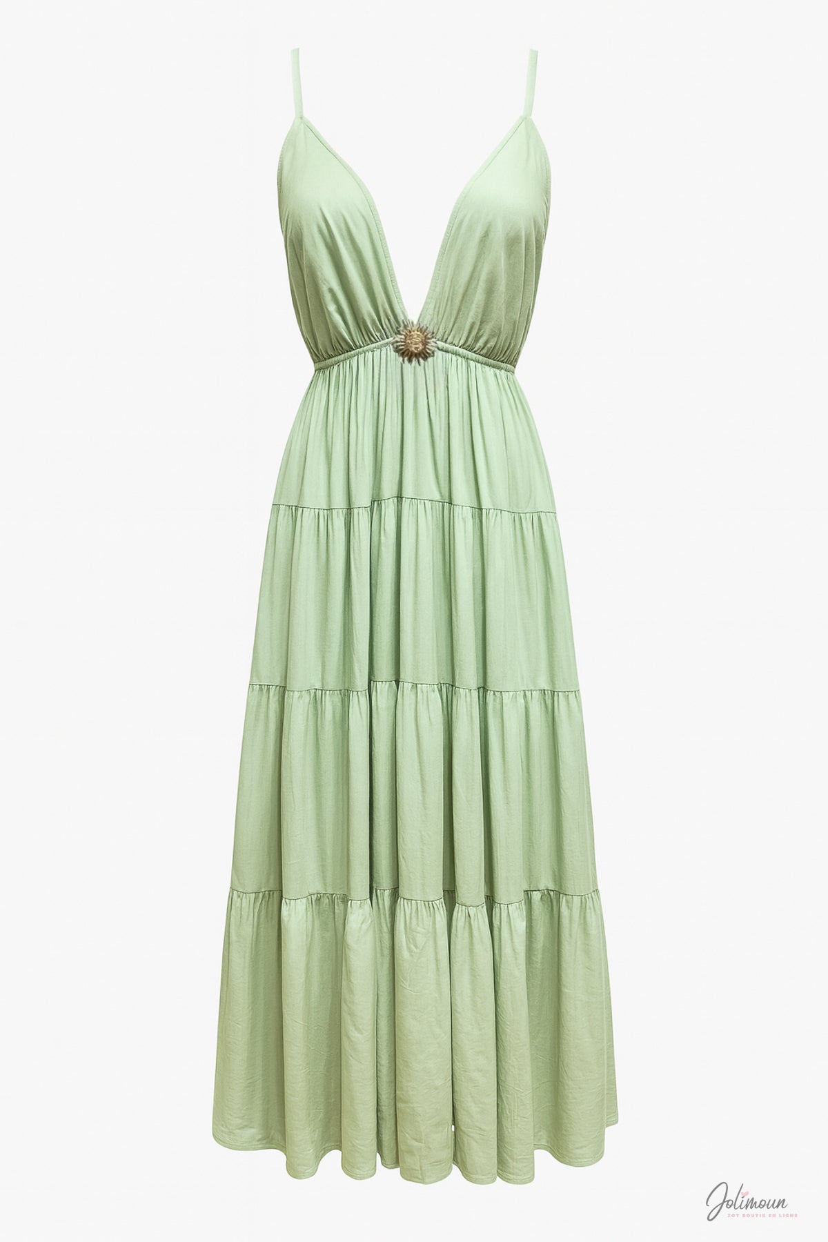 Soléa – 🌞 Robe longue vert amande en coton à fines bretelles broche soleil