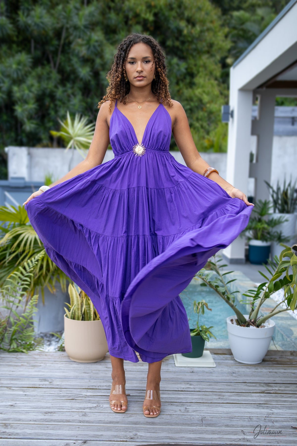 Soléa – 🌞 Robe longue violette en coton à fines bretelles broche soleil
