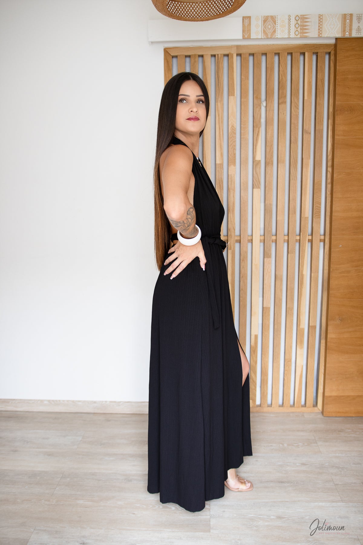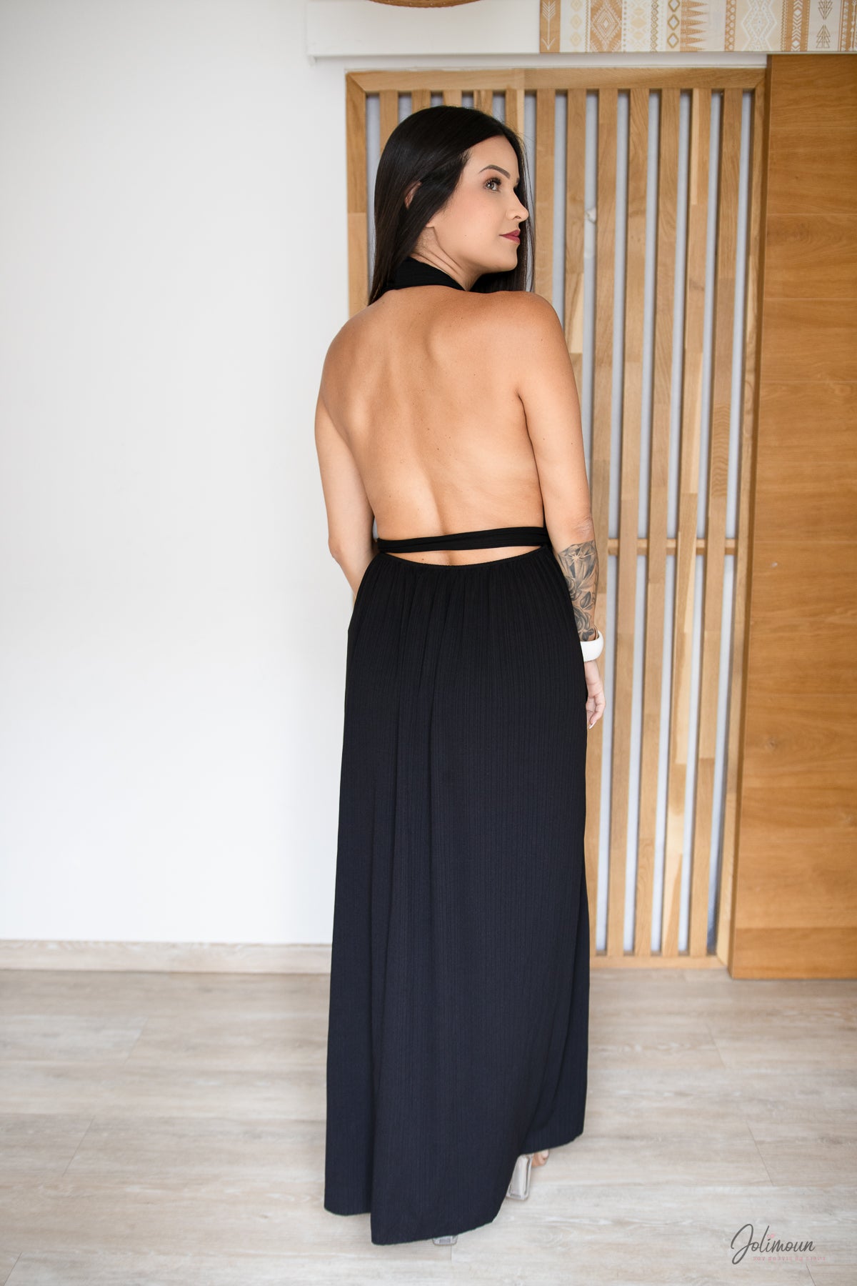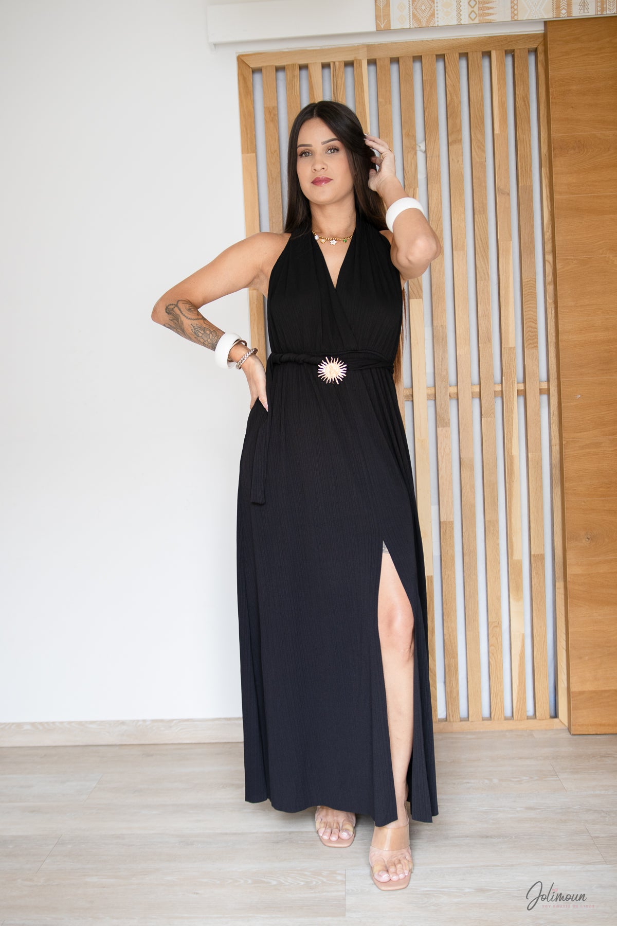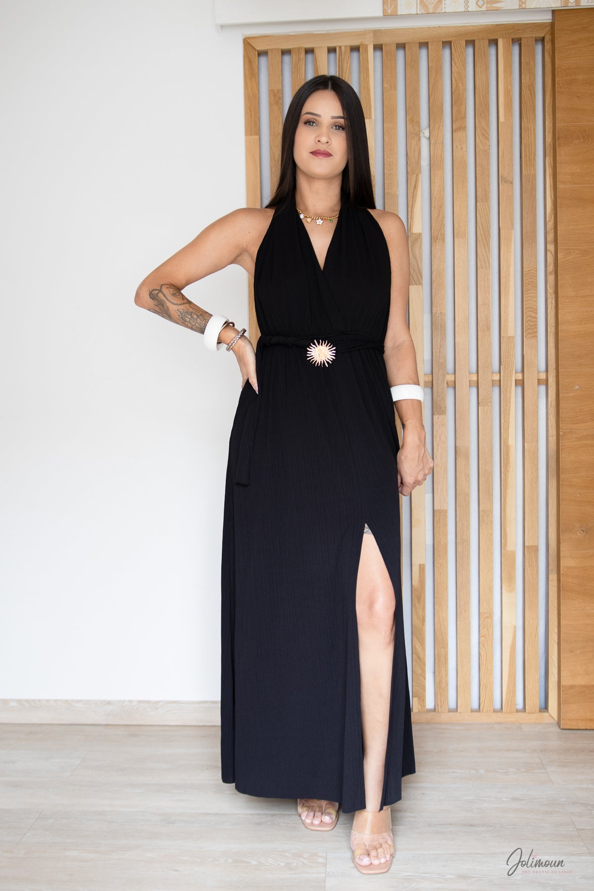 Solène – Robe longue dos nu noire à broche soleil et fente