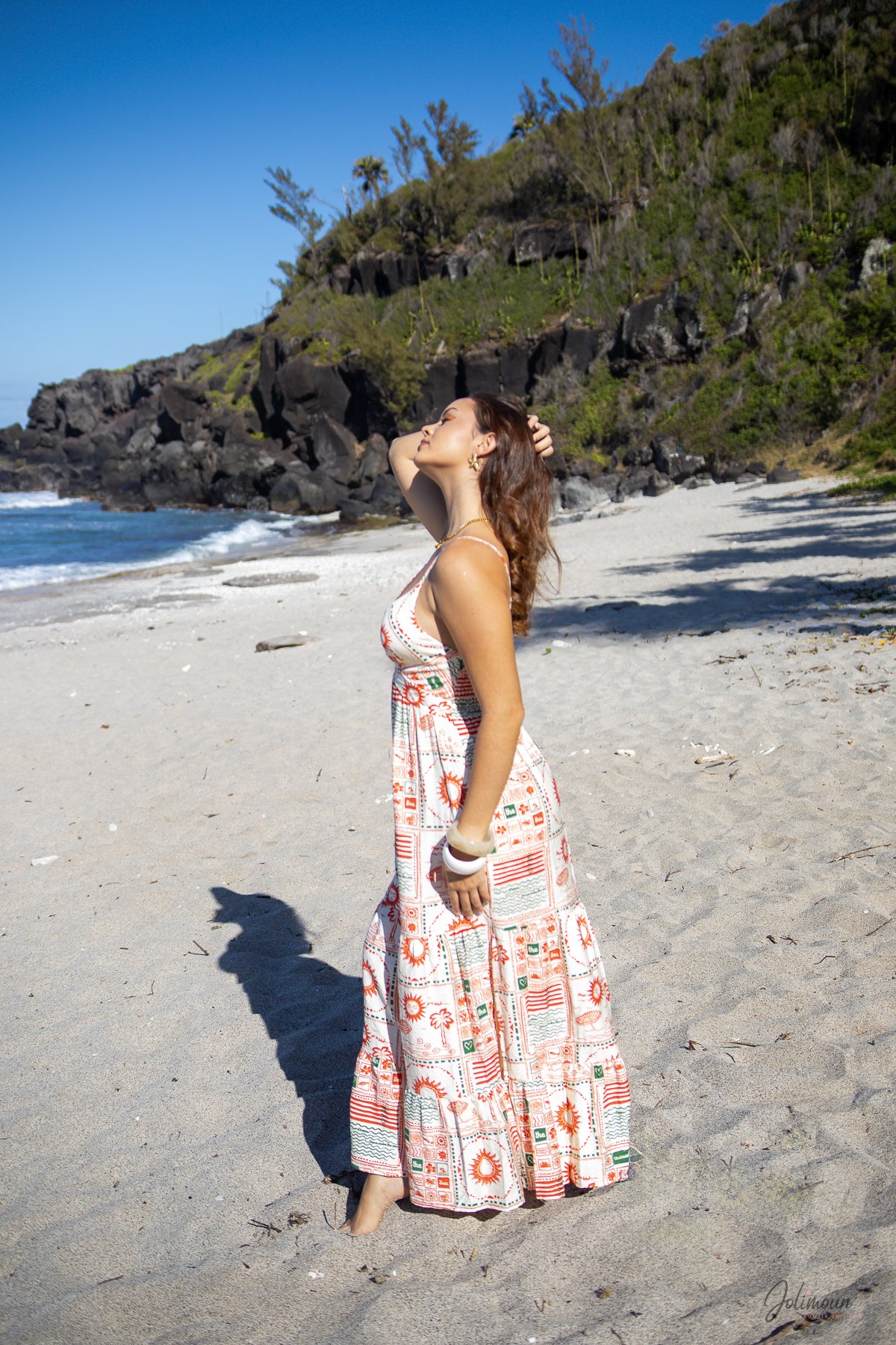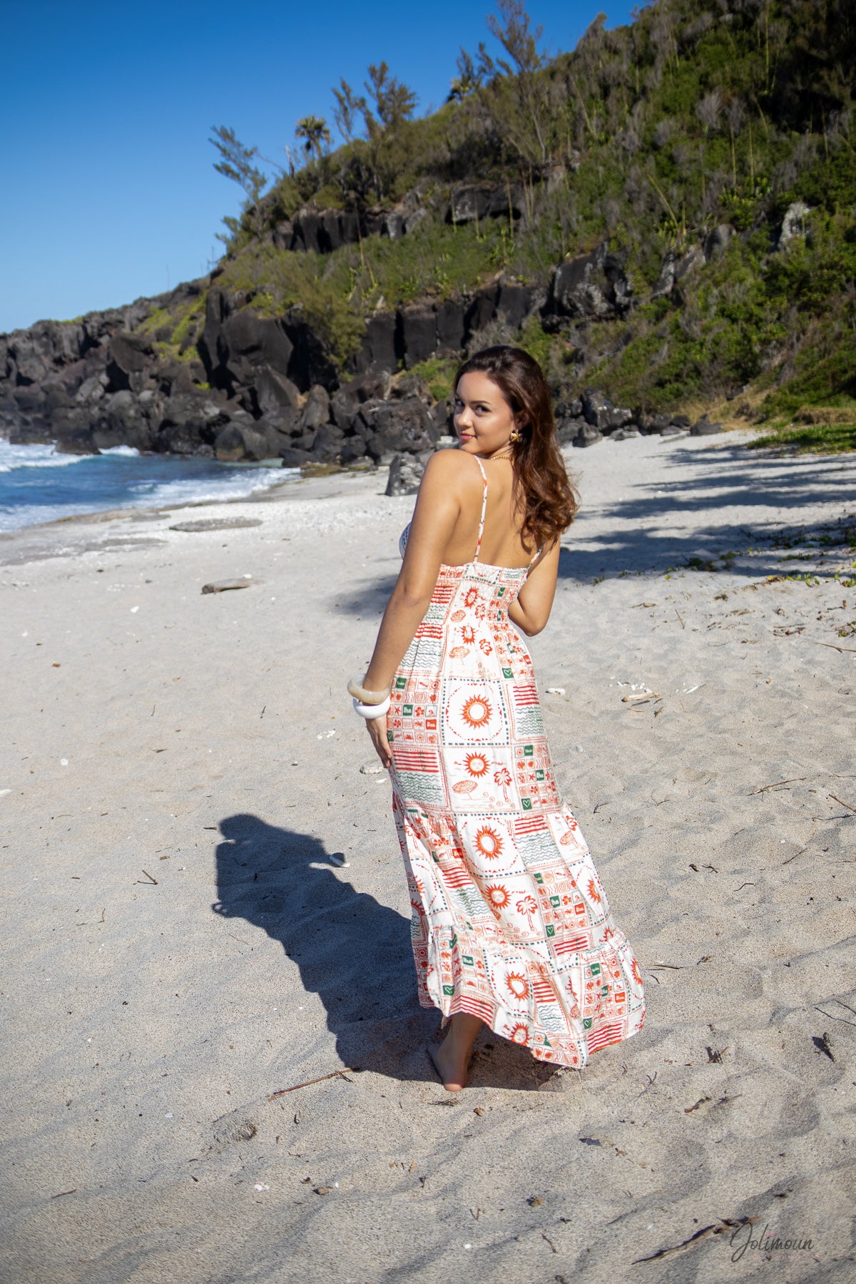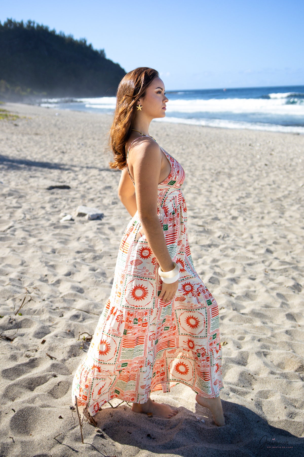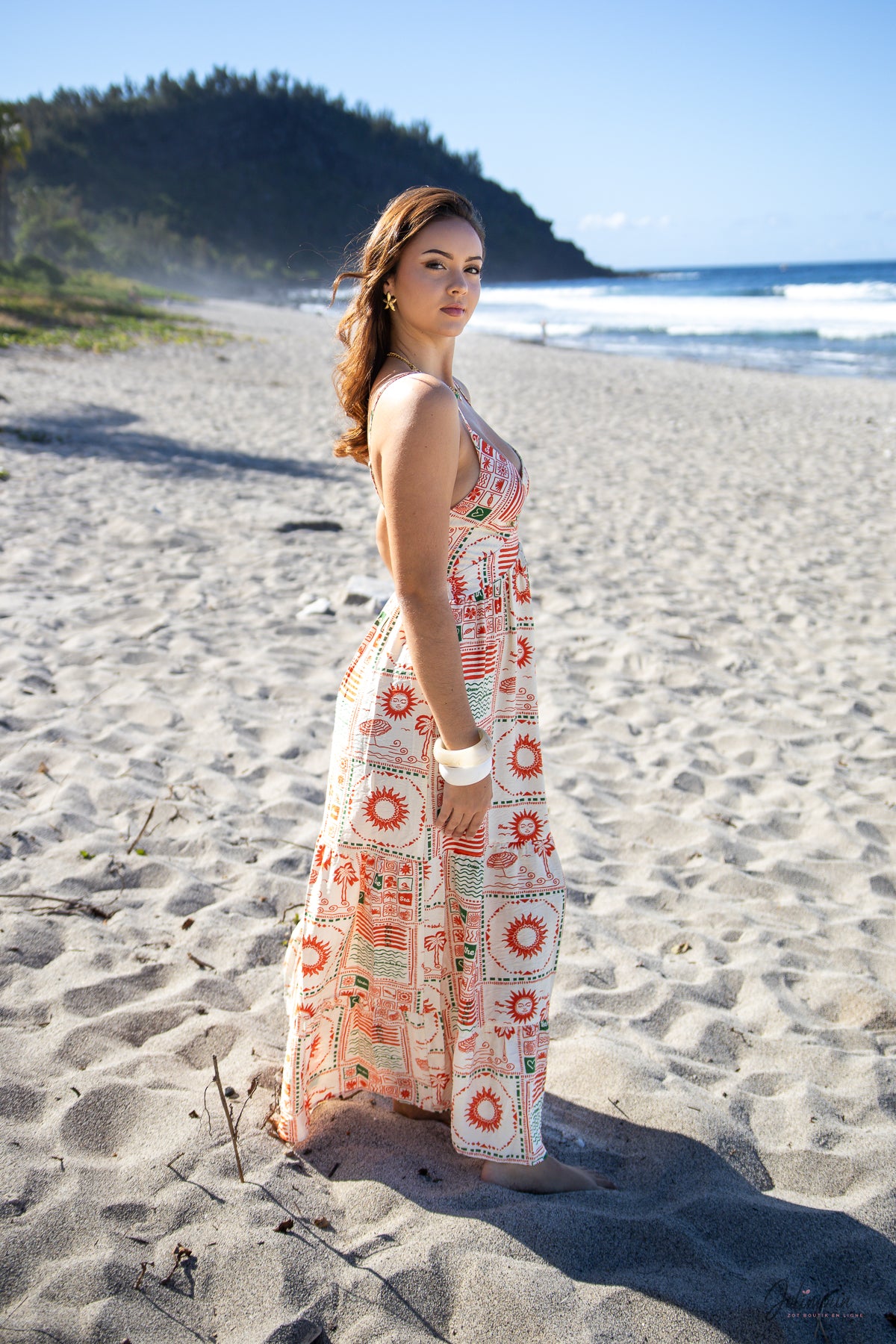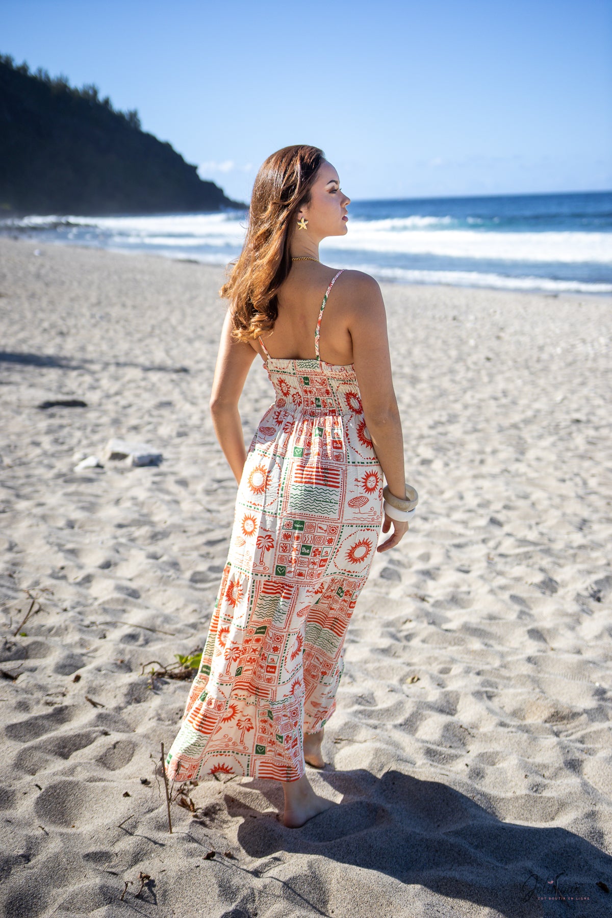 Une coupe fluide, des motifs solaires et un dos smocké pour une silhouette libre et féminine. Suzie est la robe idéale pour rayonner toute la journée.